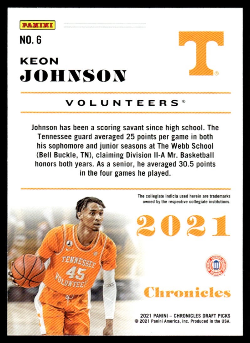 | 2021-22 Panini Chronicles Draft Picks Keon Johnson #6 RC Tennessee Volunteers |