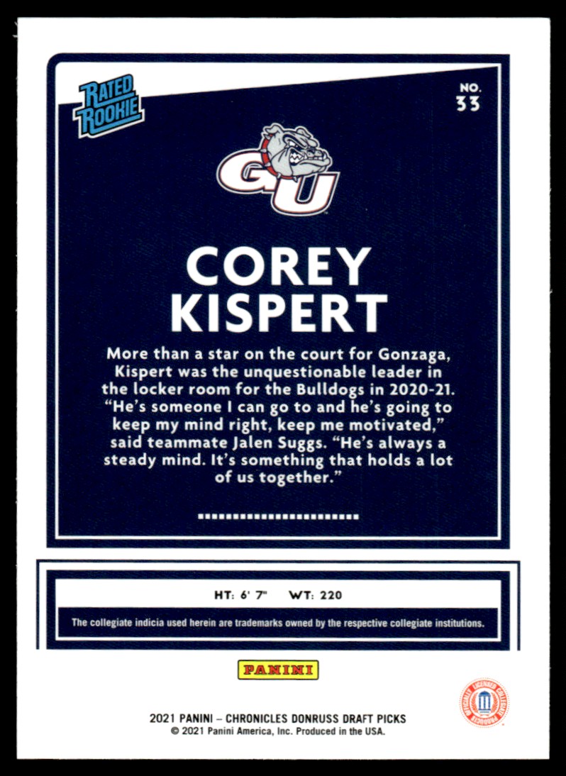 | 2021-22 Chronicles Donruss Draft Picks Rated Rookie Corey Kispert #33 RC Gonzaga |