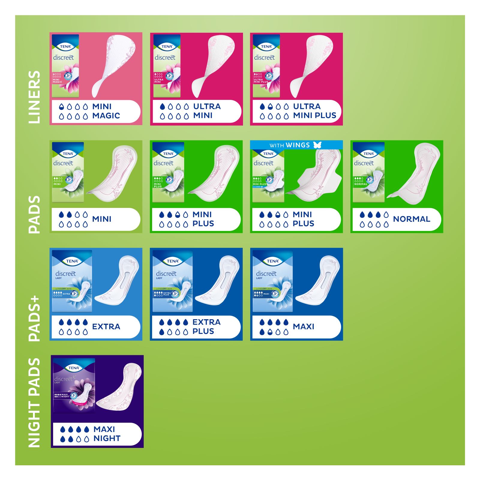 TENA Lady Discreet Normal with microPROTEX™ compressing technology gives TRIPLE PROTECTION from leaks, odor and moisture. TENA Lady Discreet Normal is the same size as a menstrual towel but designed for light to medium bladder weakness. Our microPROTEX™ compressing technology gives absorbency where it matters making sure to provide the security and the discretion that is needed.