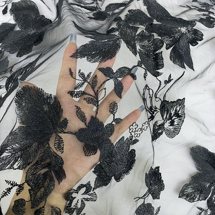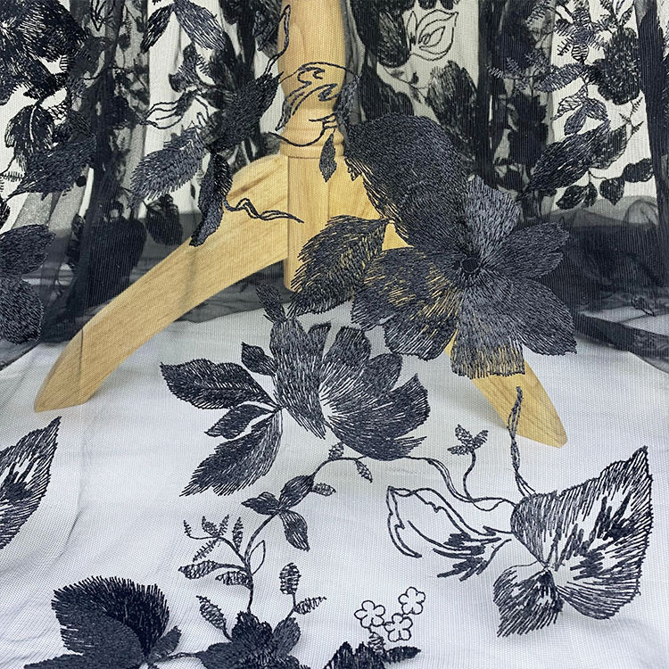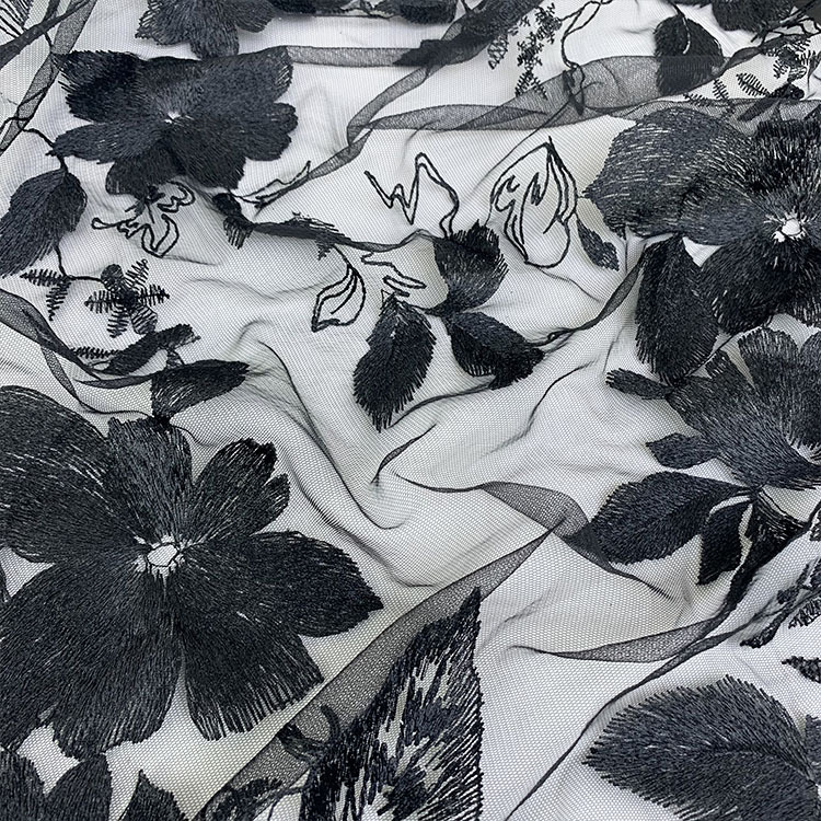 Black embroidery floral leaf lace fabric, perfect for personalized wedding gown, haute couture, bridal dress, evening wear.