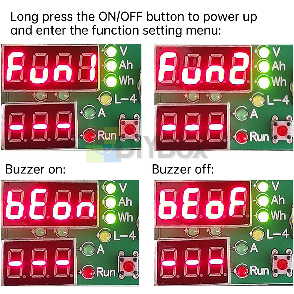 1. Mode setting "Fun1" is electronic load mode, "Fun2" is battery capacity test mode.