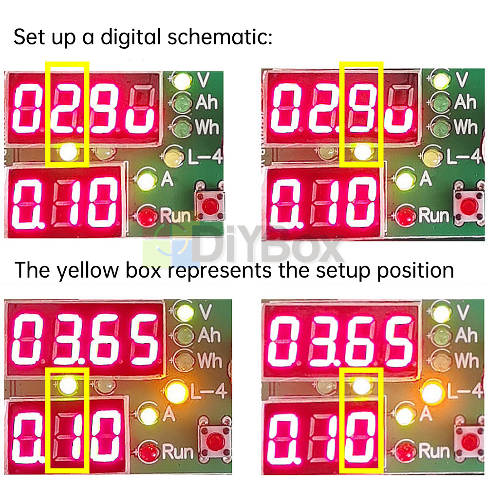 2. Set the current and the lower limit voltage through the knob, rotate the knob to set the value of the current setting position, press the knob to switch the setting digit, the number of the current setting position will blink, more than 3 seconds of inactivity will automatically exit the setup back to the normal display of voltage and current.