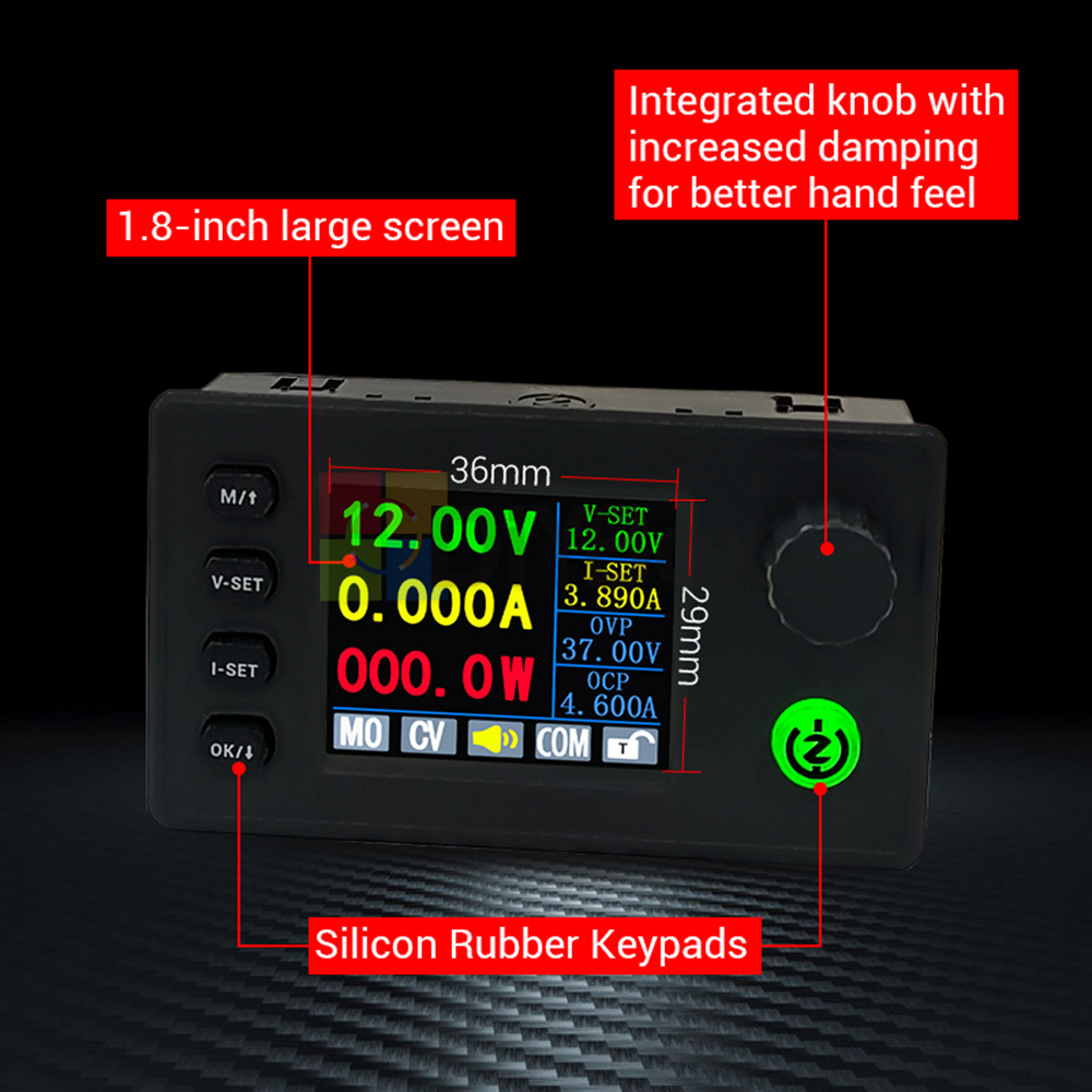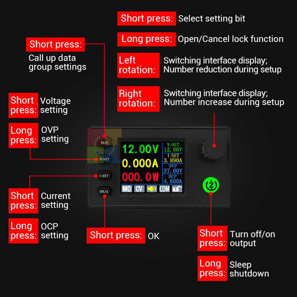 Output overvoltage protection (OVP): 0.5-37V adjustable, factory default 37V