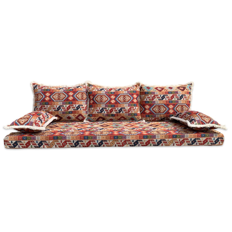 Immerse yourself in the exotic charm of Moroccan decor with our traditional floor sofa set. Inspired by authentic kilim rug patterns, this set effortlessly brings a touch of bohemian elegance to your home. Perfect for creating a cozy and stylish seating area, this set includes 6 outer zippered main covers and 6 inner zippered covers for easy filling and maintenance.