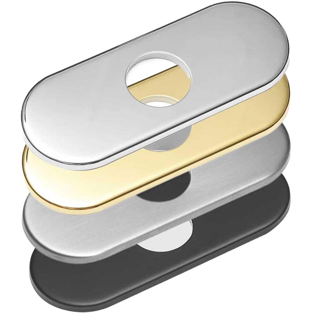 Quality tap sink hole cover plate for kitchen or bathroom taps comes in fours different colours to choose from: chrome, brushed nickel, gold or black. This tap plinth will cover unused mounting holes in bathroom sink or countertop. Sink hole deck plate is made from stainless steel sheets. It is also equipped with special bottom thick sponge pad which prevent looseness or material bending. The size of this tap base plate escutcheon is 160x62mm.
