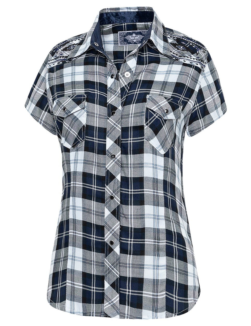 Kurzarm Western-Karobluse mit Stickerei an Schultern und Rücken, aufgesetzten Brusttaschen, Druckknöpfe und Satinbesatz an Halsausschnitt, Knopfleiste und Taschenklappen