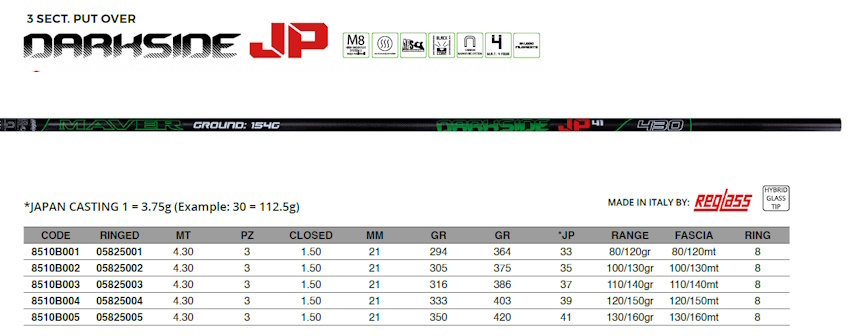 146gr - 4.30mt: More power, more distance but really nothing heavy ! This in another feature for the perfect japan style rod. You can use and choose the classic 5 oz lead making side or ground cast even using 0,06 mm Pe braid, reaching incredible distances. Like all the Darkside JP, also this model is available in blank naked version, in order to personalize the wrapping based on your needs . Ideal casting range 120-150 grams. Ideal distance 120-150 meters.