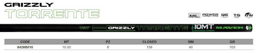 La Grizzly Torrente è stata progettata con materiali ad alta elasticità e spessori a basso contenuto di resina, ottenendo così una resistenza alla trazione superiore del 30% rispetto ai tessuti di carbonio standard. La canna risulta molto pronta e ferma nel fusto ma gli ultimi tre elementi consentono un eccellente azione di pendolo mantenendo una perfetta sensibilità alla tocca e reattività alla ferrata.