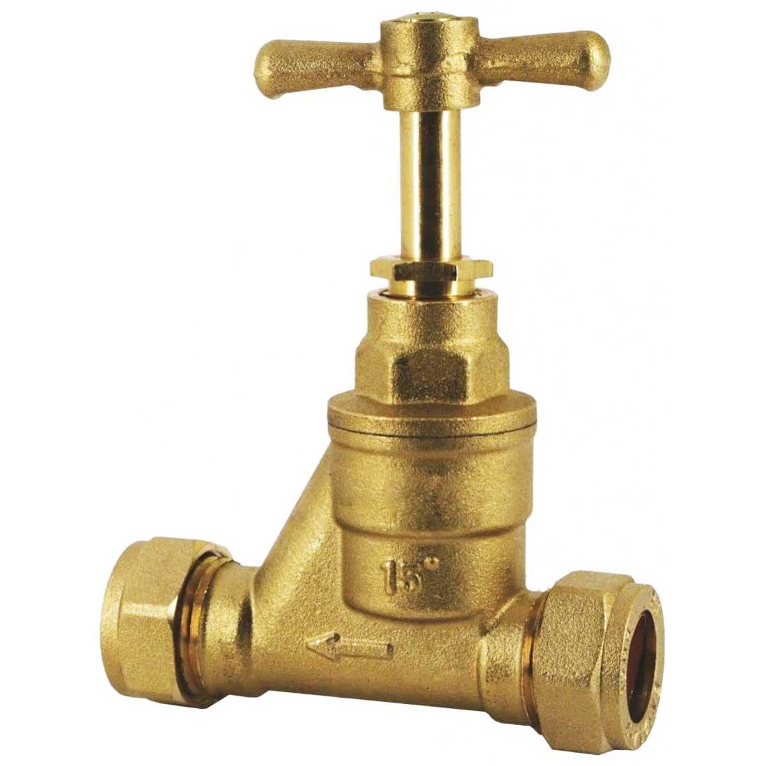 Brass stopcock in 15mm or 22mm compression connection on both ends for quick, simple installation in line on 15mm or 22mmm pipes. Brass, steel and plastic construction. Manufactured to BS1010. This shut off valve is suitable for water systems only. Can be used with both hot and cold water.