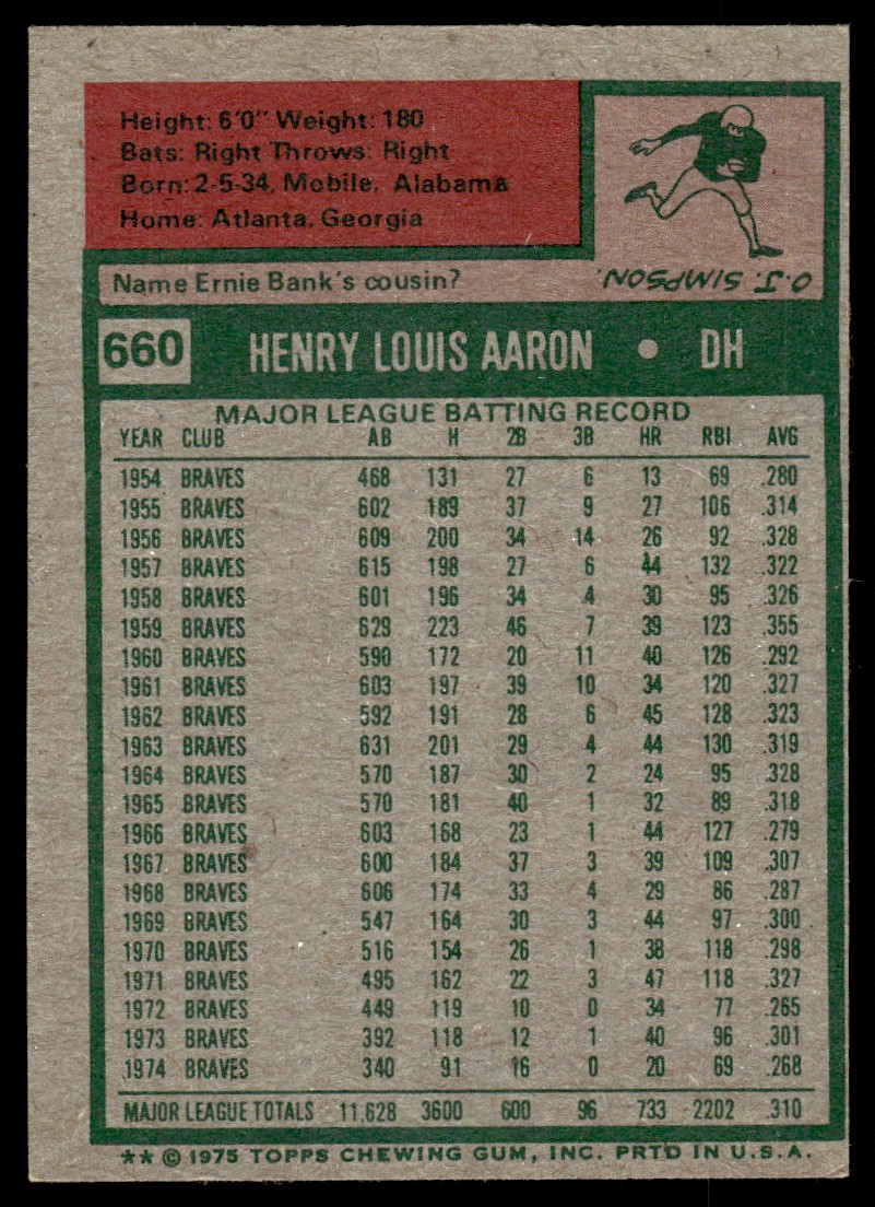 | 1975 Topps Baseball Card Hank Aaron Milwaukee Brewers #660 EX |