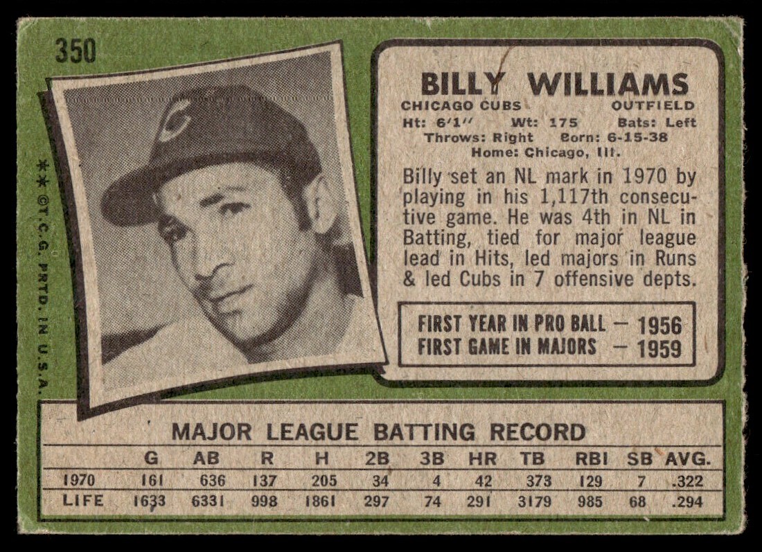 | 1971 Topps Baseball Card Billy Williams Chicago Cubs #350 VG |