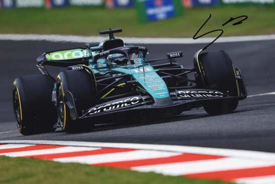 IP signed photograph, shows Lance Stroll in a racing scene (Aston Martin 2024), 12 x 8 inch, obtained In-Person (May 2024), signed in black felt tip, in very fine condition.