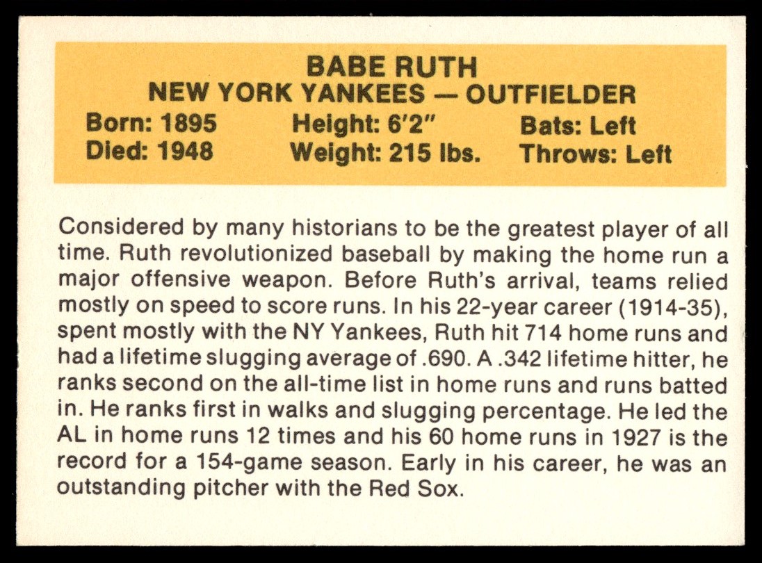 | 1987 Hygrade All-Time Greats Babe Ruth New York Yankees #NNO EX+ |