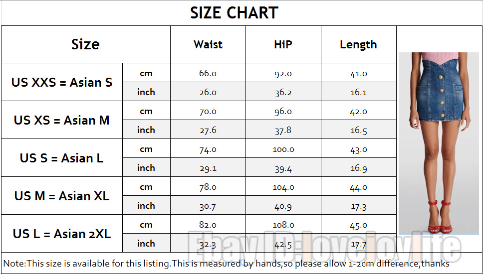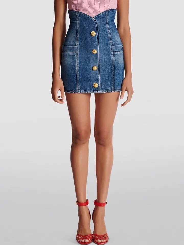 Women Lady Denim Skirt High Waisted Mini Skirt With Gold Buttons Slim Fit Blue