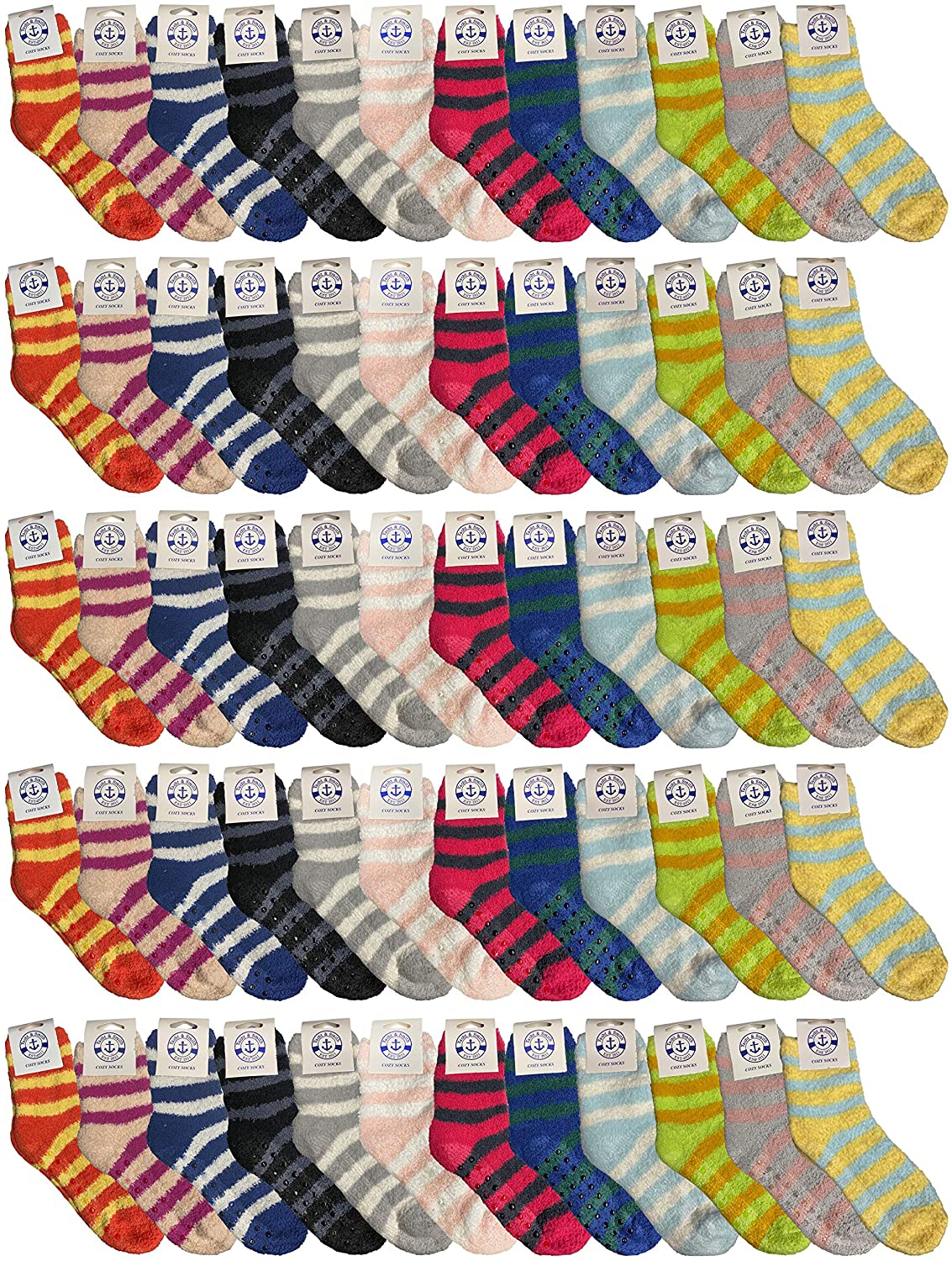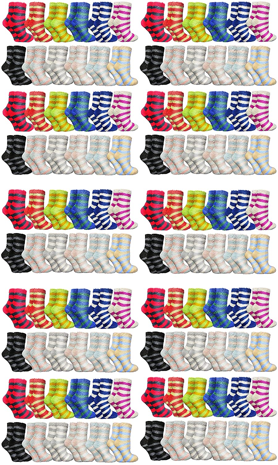 Get 120 pairs bulk pack of women's fuzzy socks in assorted solid colors. This value bulk pack ensures that you do not run out of fuzzy socks for a long time. Get through the winter easily with these soft and plush socks by keeping your feet warm and comfortable. Perfect for lounging or sleeping in. Perfect for gifting or donations. Made with 100% polyester. Size 9-11 will fit womens shoe sizes 5-10.