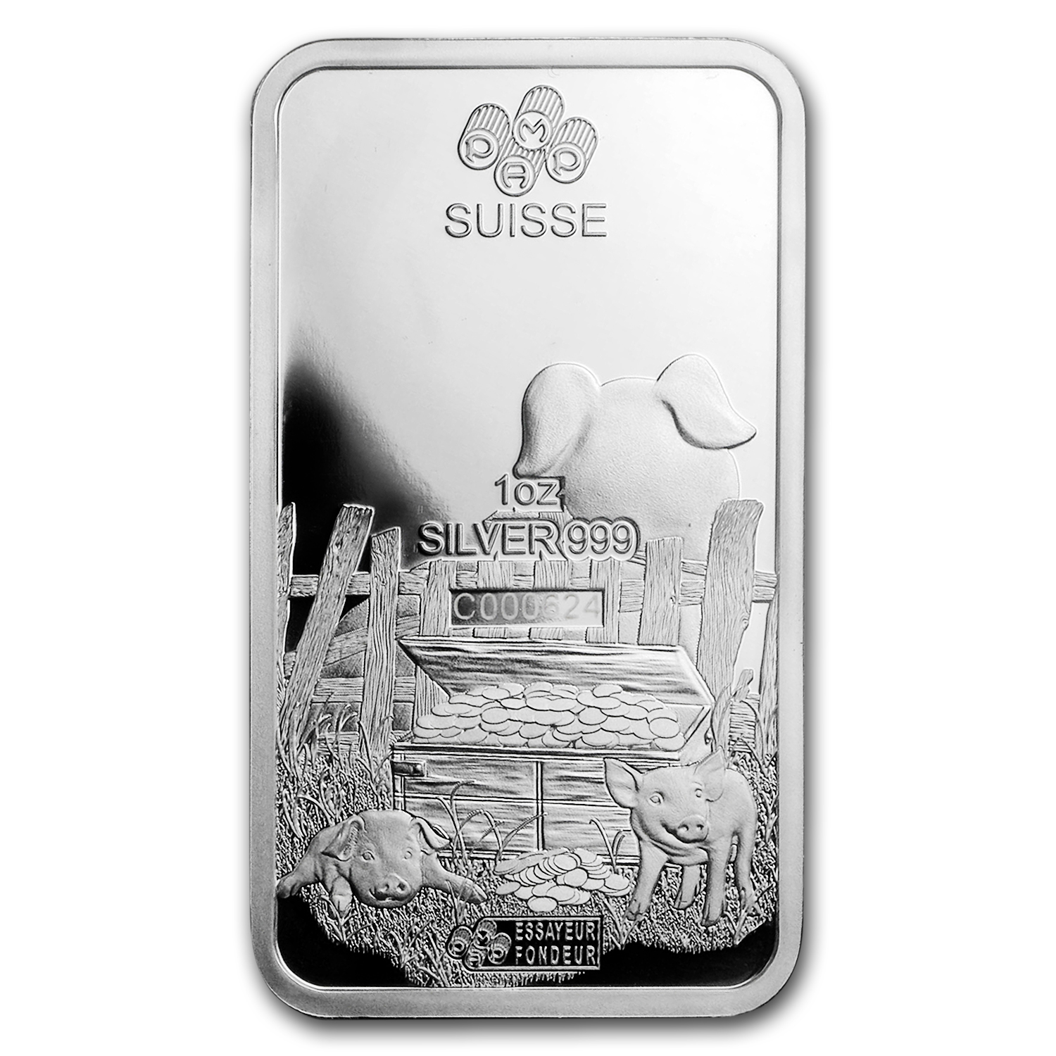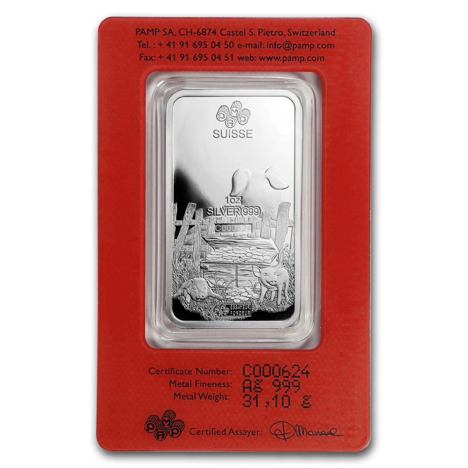 - Contained on the red assay card is a serial number matching the one on each Silver Year of the Pig bar, and guarantees the weight and purity of these PAMP Silver Bars.
