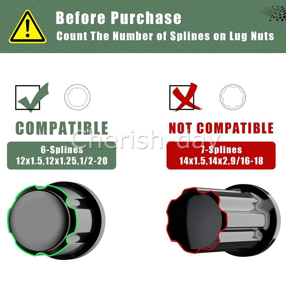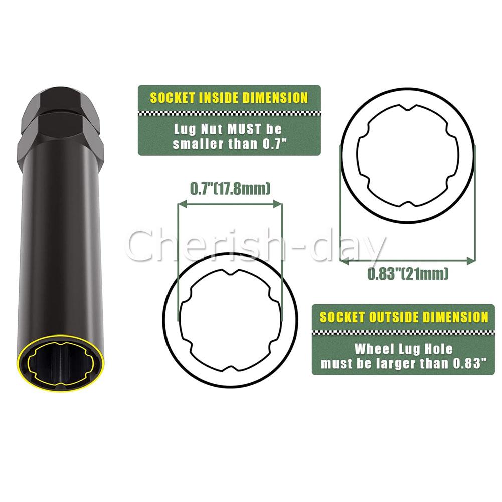 About this item 【Fitment】 6 Point Spline Tuner Lug Nut Socket Key Tool Compatible with M12x1.5, M12x1.25, 1/2-20, M10x1.25, 3/8-20Threads Pitch Spline Lug Nuts 【Material】 Not Easy to Break, Meets or Exceeds OEM Factory Standards. Durable Steel Plus Black Coating:Anti-Rust [Electrophoresis Painting] ,Anti-Cracked [Heat-Treateds] 【Size】 ID-0.7"(17.8mm), OD-0.8"(20mm), Overtall-3.5"(90mm), Depth-1.78"(45mm), 6 Splines Points. Compatible with 19mm (3/4) and 21mm (13/16) Replacement Hex Socket.