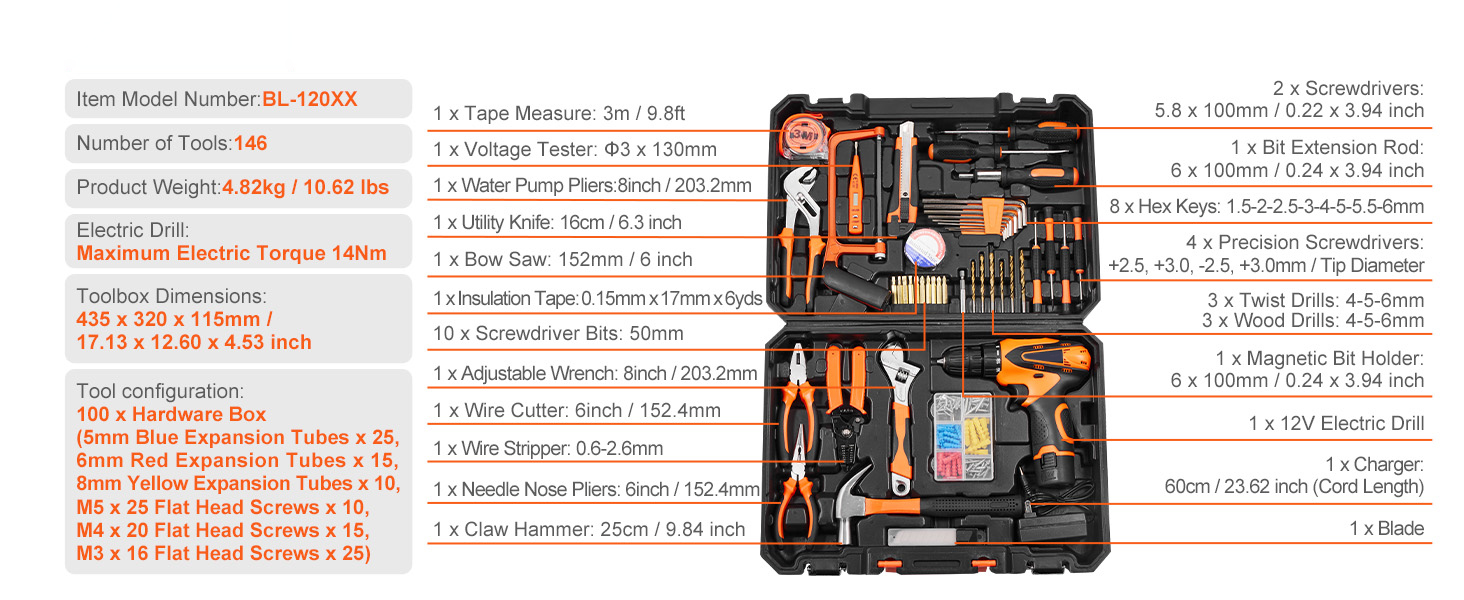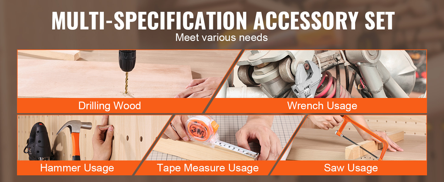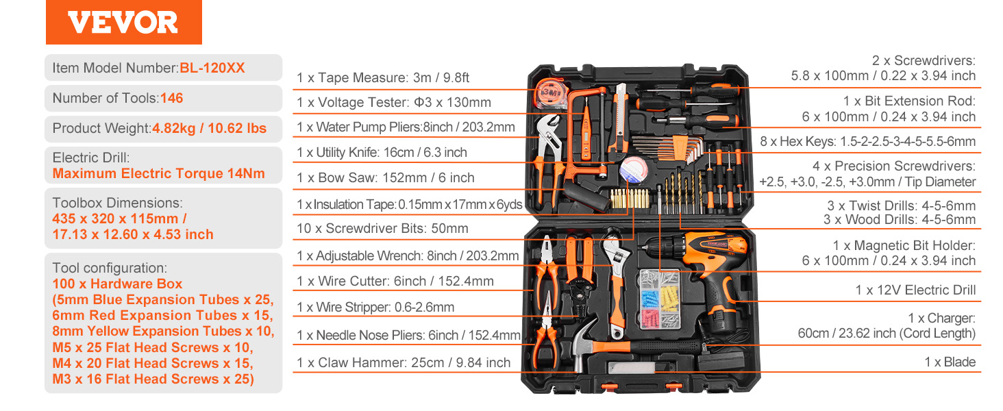 Versatile Tool Set: Our tool kit includes the electric drill, precision screwdriver, adjustable wrench, tape measure, claw hammer, bow saw, and more practical tools to meet all your repair needs. Whether it's home repairs, DIY projects, or car maintenance, the VEVOR household tool kit provides a comprehensive solution for you.