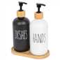 An elegant alternative to plastic and ceramic, these chic container bottles feature an off-beat 'HANDS' and 'DISH' type decoration, and a durable plastic pump with trendy bamboo accents.