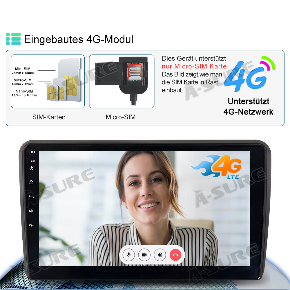 4G/WiFi:Das Radio verfügt über einen SIM-Kartenleser und stellt während der Nutzung 4G-Daten bereit, um Probleme wie instabiles WiFi zu verhindern, die zu Unterbrechungen der Radio-Wiedergabe oder ungenauer Navigation während der Fahrt führen könnten. (Dieses Gerät unterstützt nur Micro-SIM-Karten.) Unterstützt WiFi-Verbindung; nach dem Verbinden mit WiFi können Sie jede Anwendung aus dem App Store herunterladen, wie z.B. YouTube, TikTok, Spotify usw. Das Auto-GPS mit präziser Positionierung und stabilem Signal unterstützt die Verwendung von Online- oder Offline-Karten.