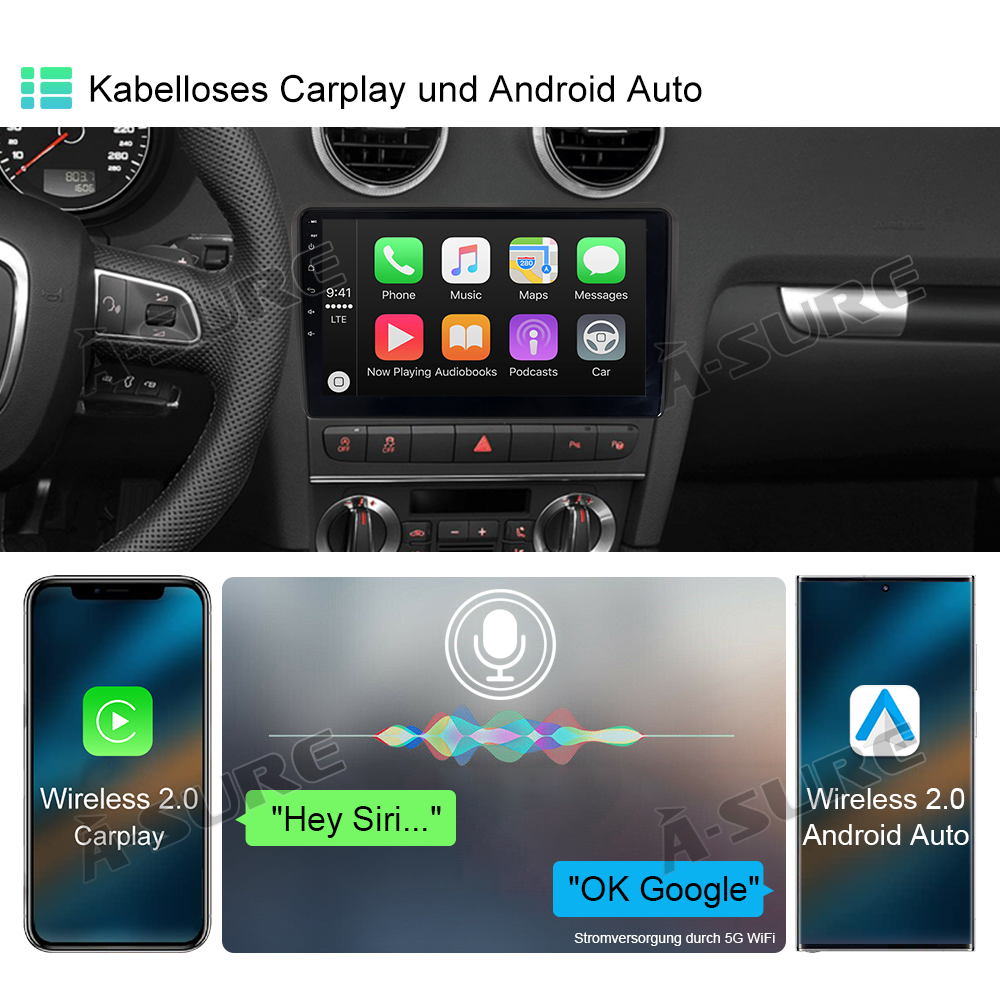 Wireless Carplay & Android Auto :CarPlay ist Apples sprachaktiviertes System für Autos, das darauf abzielt, über Siri und Ihr iPhone eine vereinfachte Startseite auf dem Touchscreen des Autos anzuzeigen, ohne dass Sie ständig auf den Bildschirm starren oder Tasten bedienen müssen. Sie können auch mit CarPlay interagieren, indem Sie die Sprachtaste am Lenkrad drücken. Android Auto verbindet Ihr Android-Handy mit unserem Radio und zeigt Ihre Android-Apps direkt auf dem Bildschirm an. Tippen Sie, um Navigationsanweisungen zu erhalten, verwenden Sie die Spracheingabe, um Textnachrichten zu senden, und tätigen Sie sogar freihändige Anrufe bei Familienmitgliedern. Android Auto ist darauf ausgelegt, Ihnen zu helfen, sich auf das Fahren zu konzentrieren und Ihre Zeit auf der Straße angenehmer zu gestalten.