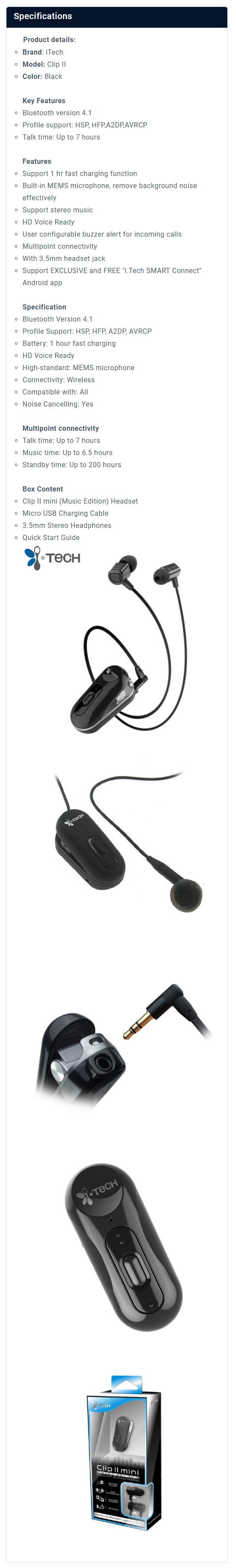 | New iTech Clip II Mini (Music Edition) 3.5mm Jack Bluetooth Stereo Headset Black Brand: iTech Model: Clip II Mini (Music Edition) Condition: New in Box Quantity: 1 Unit Color(s): Black Contents: Bluetooth Headset, Stereo Earphones, Micro-USB Cable, User Manual |