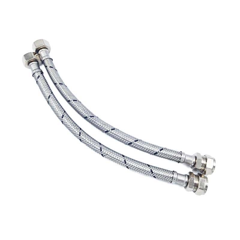 A pair of 15mm x 1/2" flexible hose pipe connectors with 15mm compression fittings on one end and 1/2" inch BSP female thread fitting on the other end. These flexible pipe tails are WRAS approved and come in 300mm or 500mm lengths. Flexible hoses can be used to directly connect 15mm water pipe supply to 1/2" BSP fittings which is standard size for toilet supply lines, shut-off valves, stop valves or many others. Flexible hose pipe is a great solution for confined spaces, as it will flex and bend to suit the system you're installing. Suitable for use with hot and cold water. Flexible pipe is easy to install with no specialist tools required.