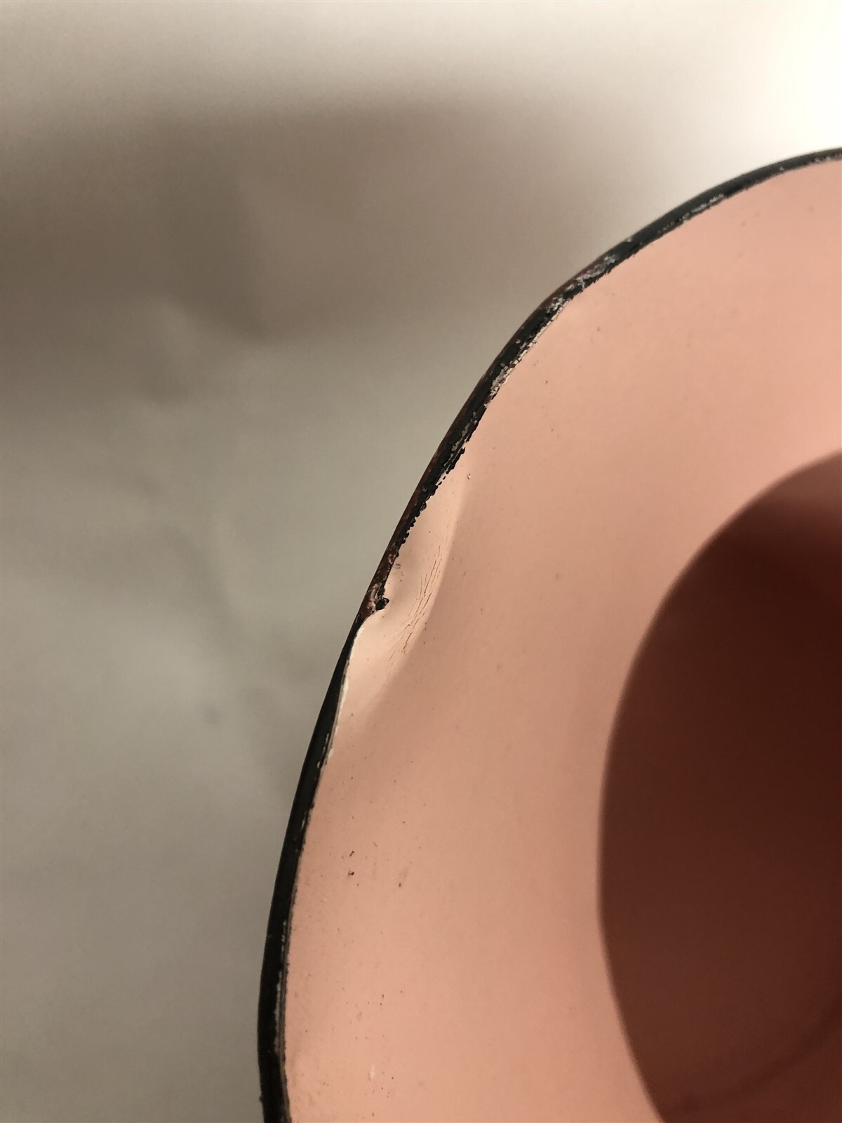 Add a pop of color to your room with our pink milk pitcher. This item is made of metal and can be used to decorate with fresh picked or artificial flowers. Its edges are lined with distressed black color.