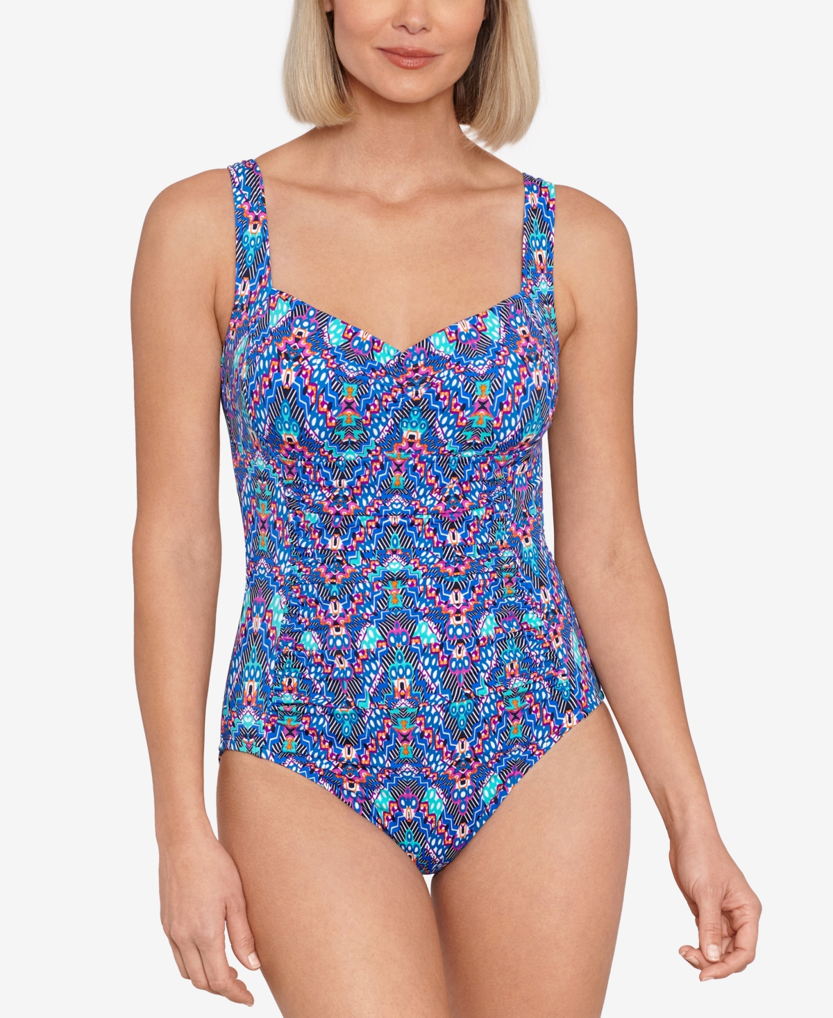 • A vibrant explosion of color and a contemporary print freshen this one-piece from Swim Solutions. Shirring at the front helps smooth your silhouette.