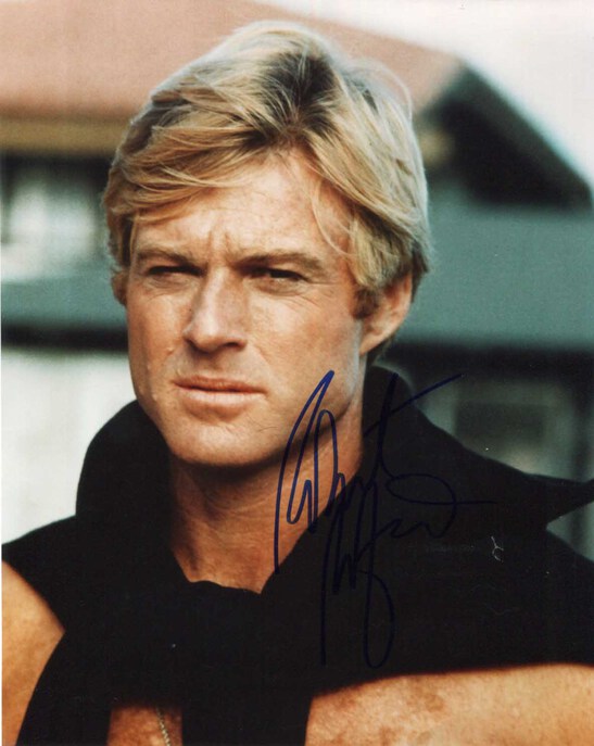 Signed photograph, shows Robert Redford in a beautiful close-up portrait, 8 x 10 inch, signed in blue felt tip, partly signed on a dark background - otherwise in very fine condition.