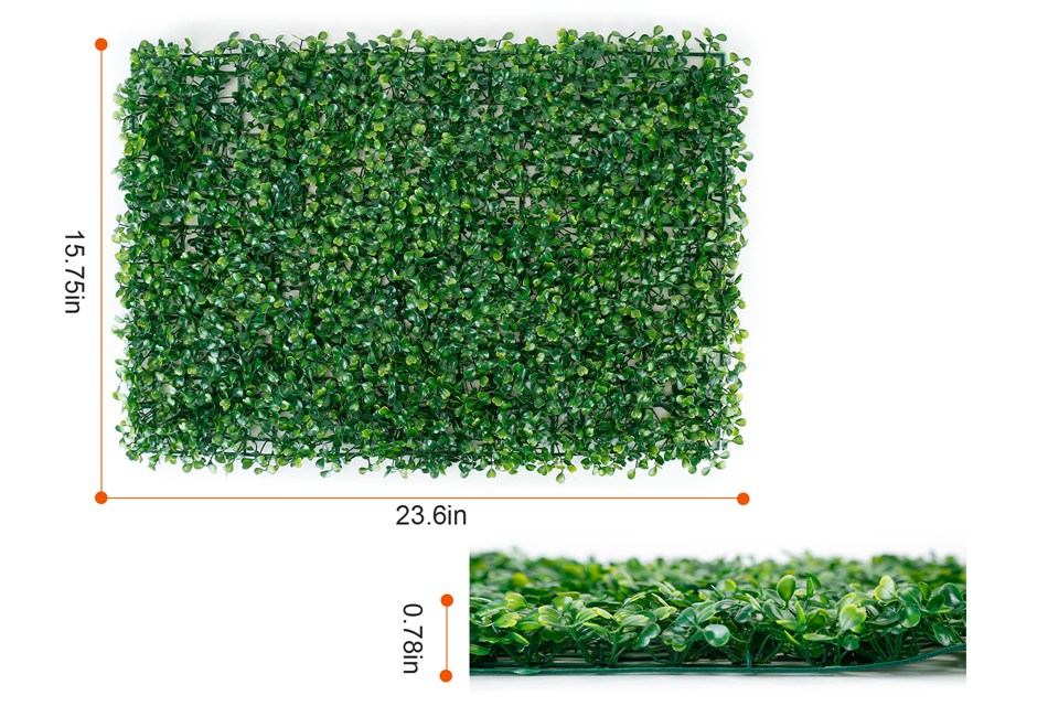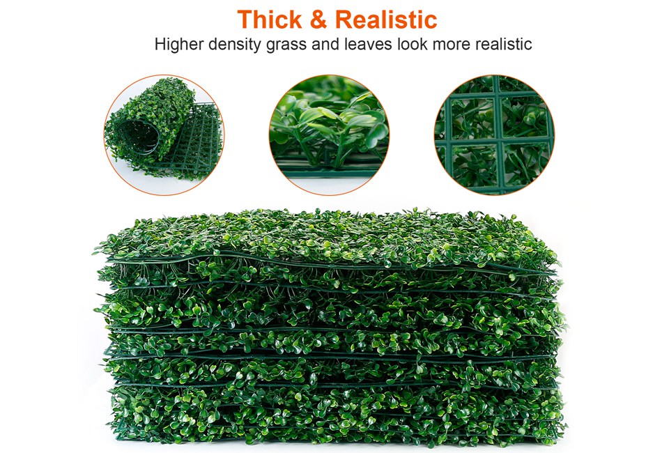12-48PCS Artificial Boxwood Topiary Hedge Plant Grass Backdrop Fence Green Grass Product Detail Image GalleryProduct DescriptionOverview:The artificial grass panel is made of colorfast, light and durable plastic material, which is an excellent green decoration inside and outside, aesthetically enhance area with a realistic look to beautify and transform your fence, walls, garden, or your own creative design on party, Wedding, Christmas decorations. Features:- *Realistic Greenery:The grass wall panel shows a more realistic appearance via green shaped leaves. And more grids provide better privacy hedges. Perfect solution for indoor and outdoor decoration.
