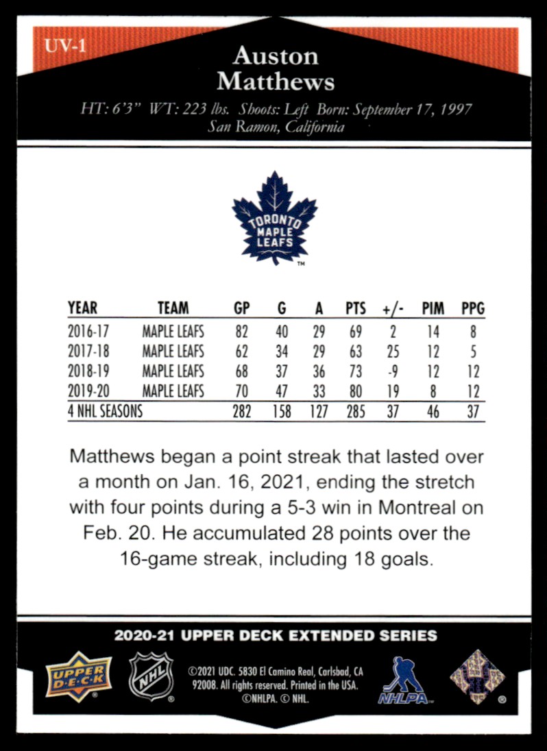 2020-21 Upper Deck Ultimate Victory Auston Matthews Toronto Maple Leafs #UV-1