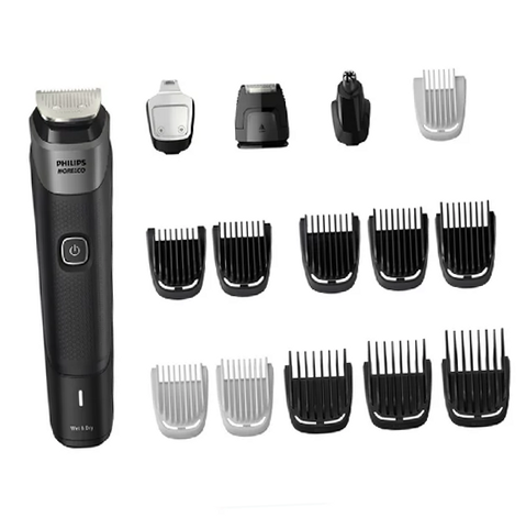 The Philips Norelco Multigroom 5000 is the all-in-one trimmer for maximum versatility. Craft your own personal look with this durable trimmer, which includes 18 quality tools for styling your face, hair, head and body, including below-the-belt grooming. The stainless steel self-sharpening blades remain sharp as day one for long lasting performance, no blade oil required. The long lasting lithium ion battery provides up to 2 hours of runtime for long life and maximum power. Plus the no-slip rubber grip improves comfort and control. Includes USB-A charging cable (wall power adapter not included). 18 tools and accessories. Steel trimmer, Steel precision trimmer, Precision shaver, Nose and ear trimmer, Eyebrow guard, 2 body guards, 2 stubble guards, 3 beard guards, 3 hair guards, soft pouch, cleaning brush and USB-A charging cable (wall power adapter not included).