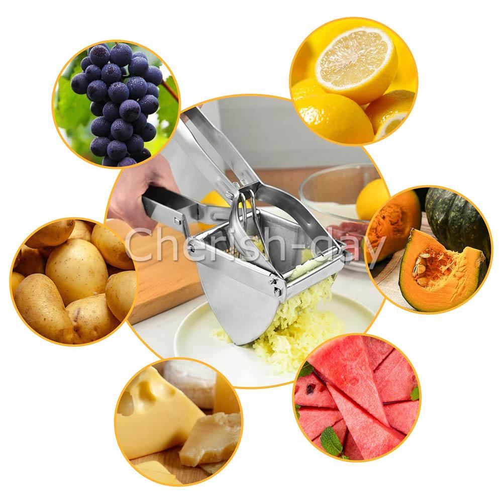 To operate, just position a potato or similar vegetable including carrots, tomato, avocado, squash, yams, egg and pumpkin between the push block and perforated well.