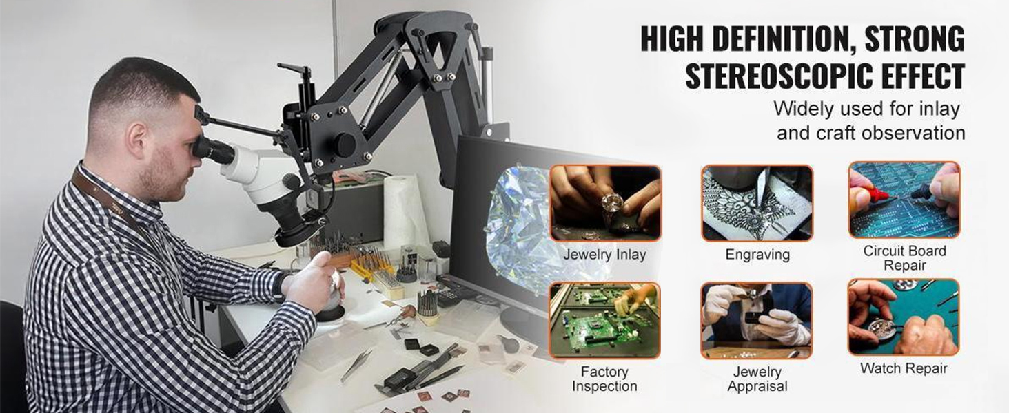 With 7X-45X continuous zoom, our jewelry microscope with spring bracket provides clear and stereoscopic microscopic effects. This micro inlaid mirror is widely used in jewelry inlay, engraving crafts, PCB repair, factory inspection, jewelry appraisal, watch repair, and more.
