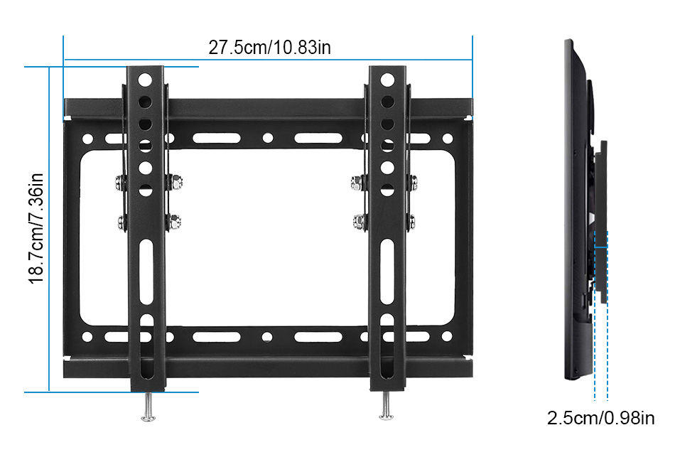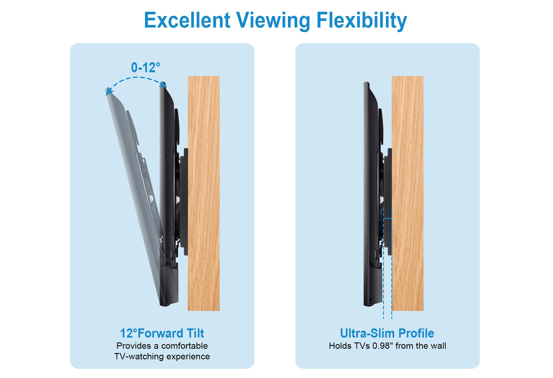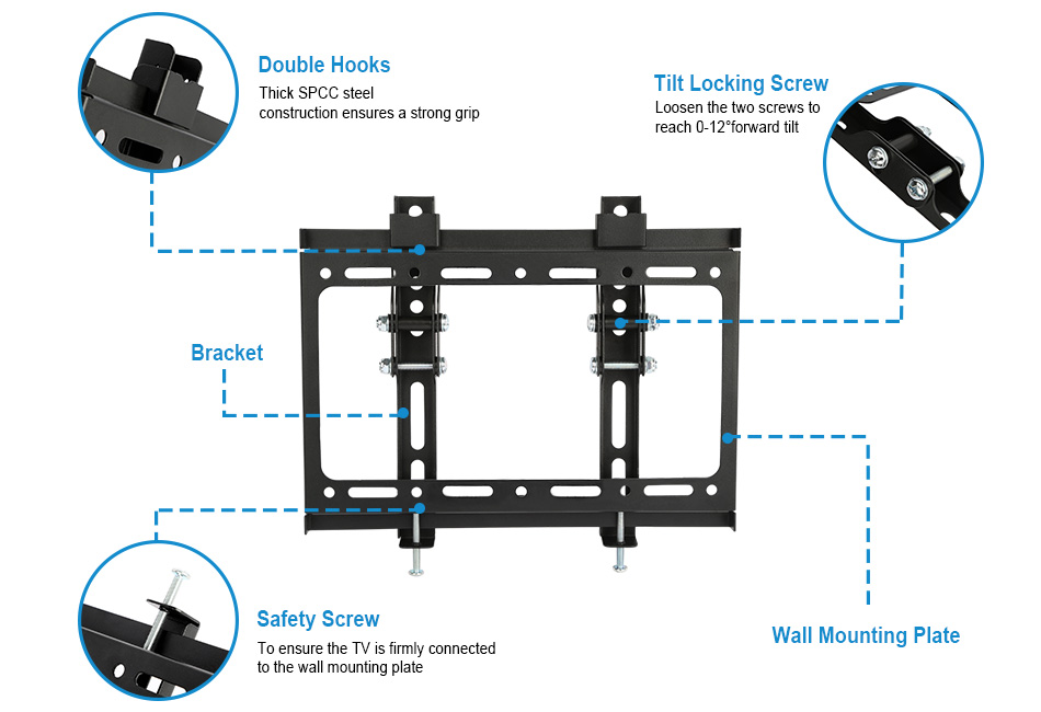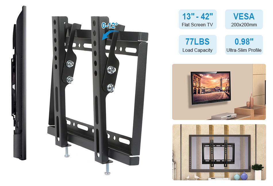 Our TV wall mount bracket is specially designed an optimal solution to save space through holding most 13"-42" LED/LCD/PLASMA flat screen TV with VESA mounting holes patterns of 200x200mm (8"x8") on the wall and its 10°forward design can provide an comfortable viewing angle when watching TV. Made from heavy-duty thickened SPCC steel materials, it is sturdy, durable and can support weight up to 77lbs. And at the bottom of the two brackets is separately equipped with a safety screw to ensure the TV is securely connected to the wall mounting plate.