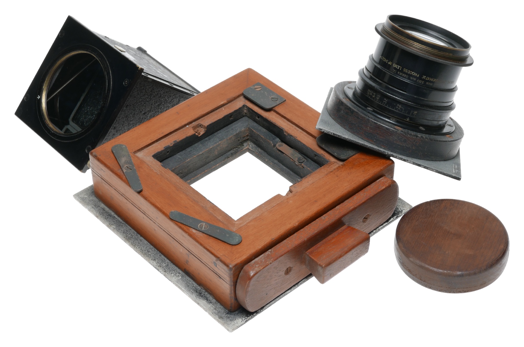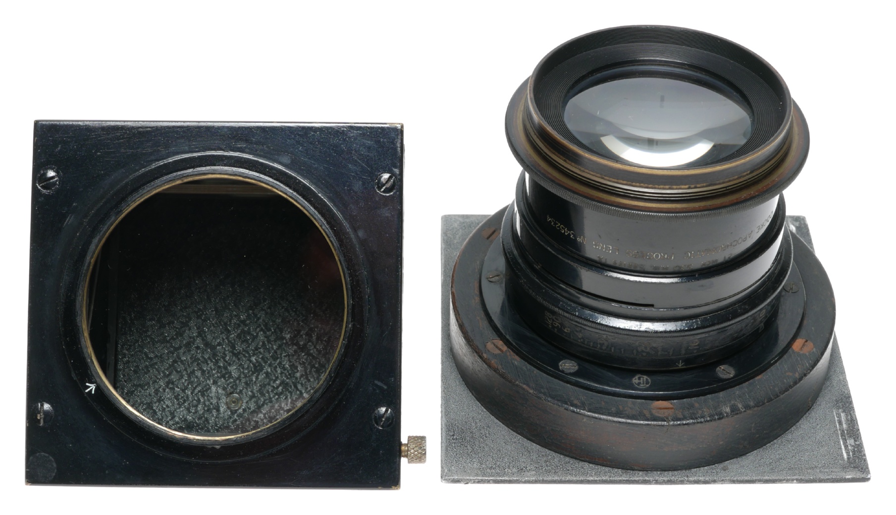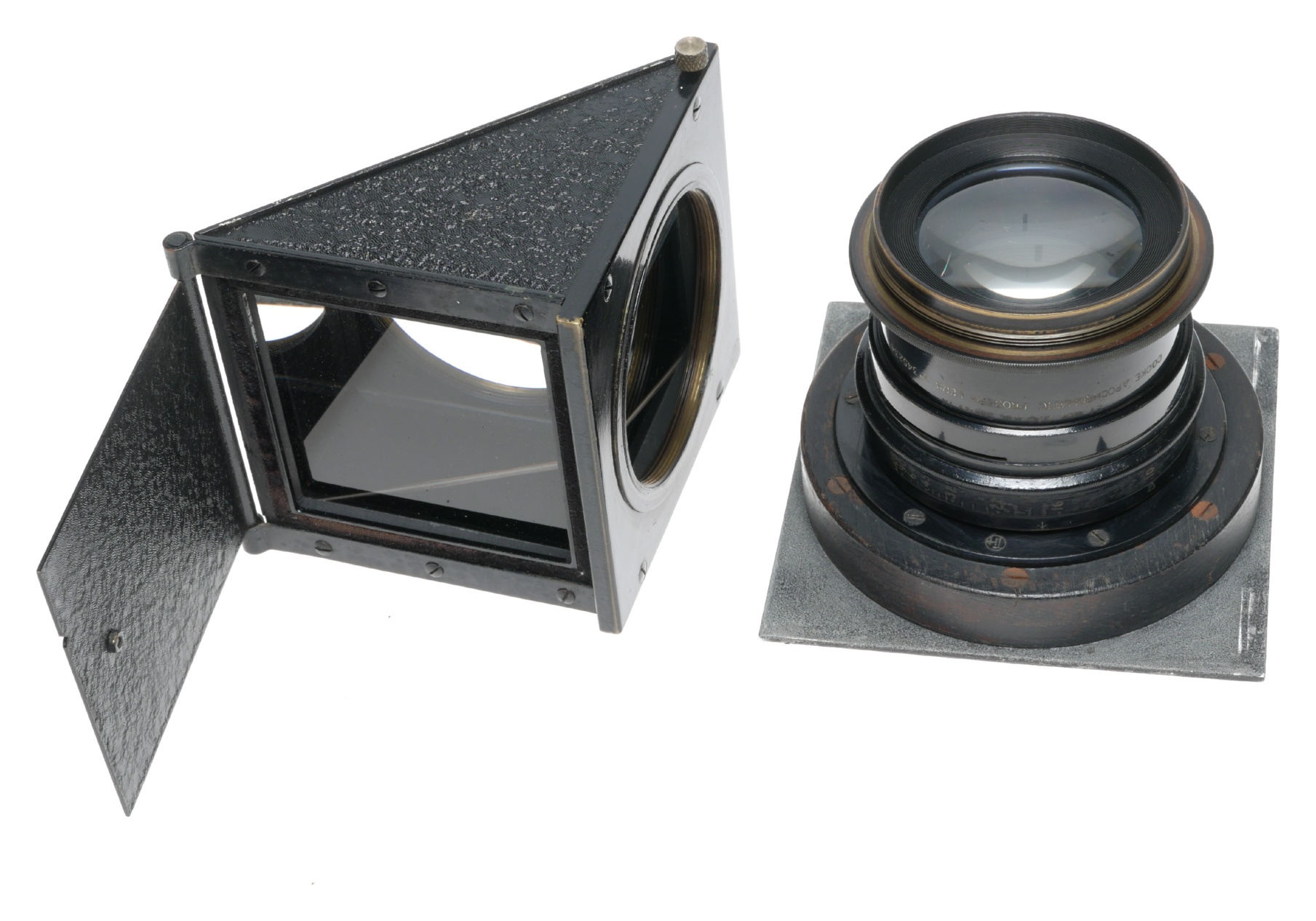 This brass, black painted 21 Inch (530mm) soft portrait lens #345234 and prism are in beautiful vintage condition, supplied with wood film back, ca.1924