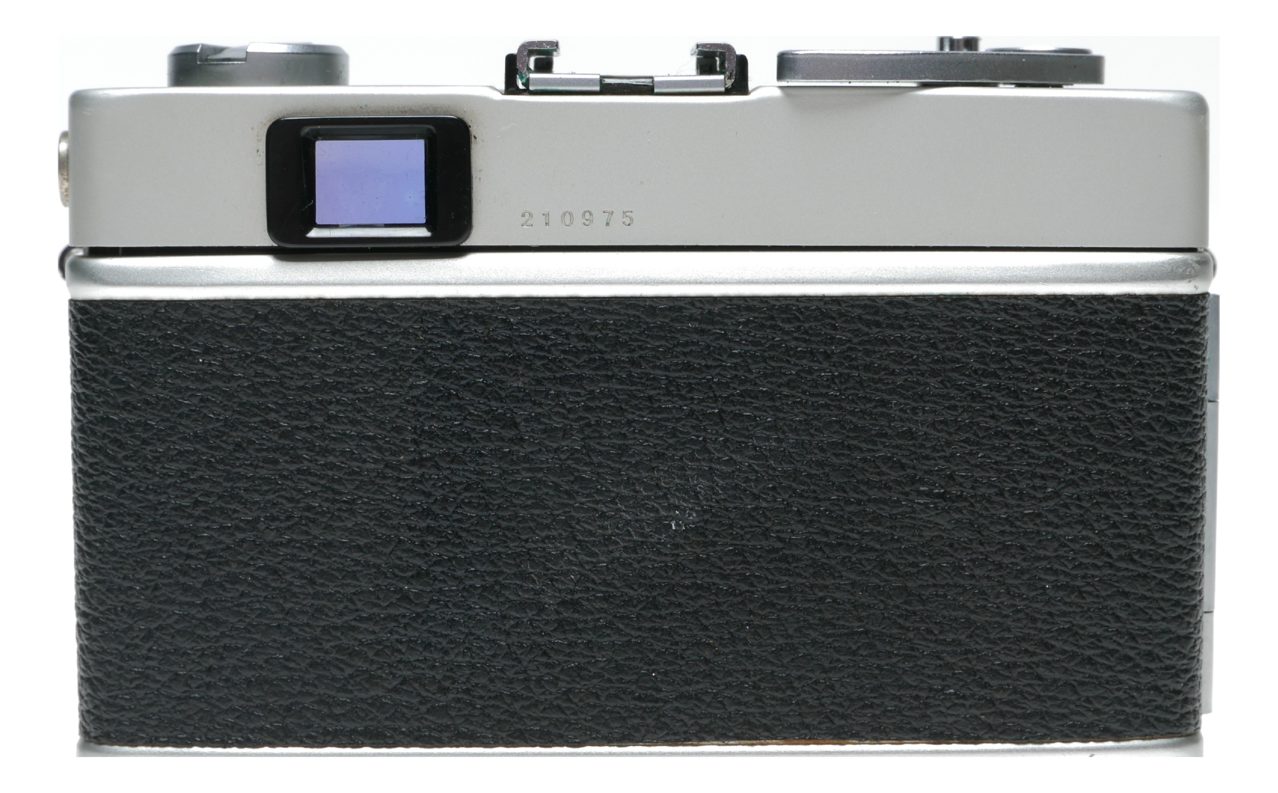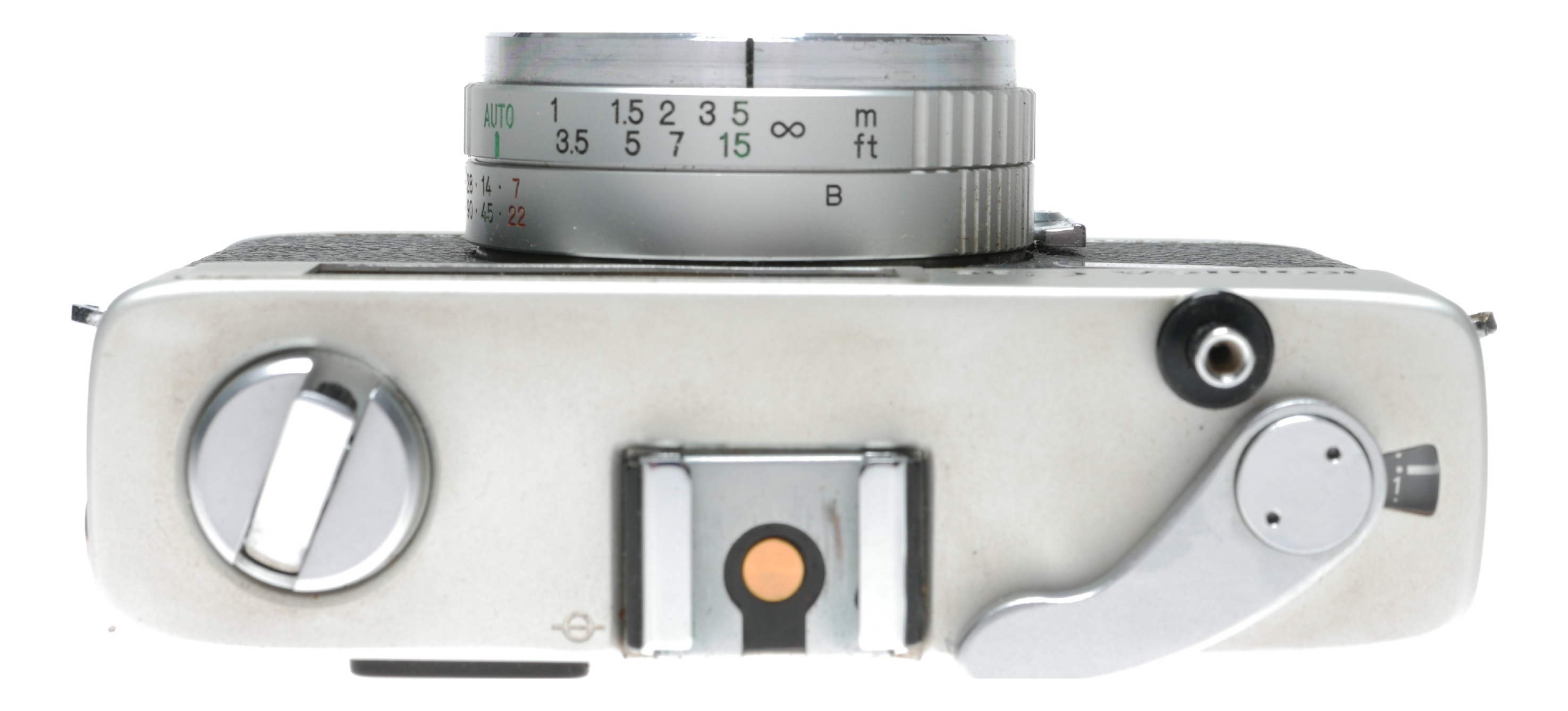 Vintage 35mm film, point and shoot rangefinder camera, in good used condition. The front lens glass shows some scratches and signs of wear.