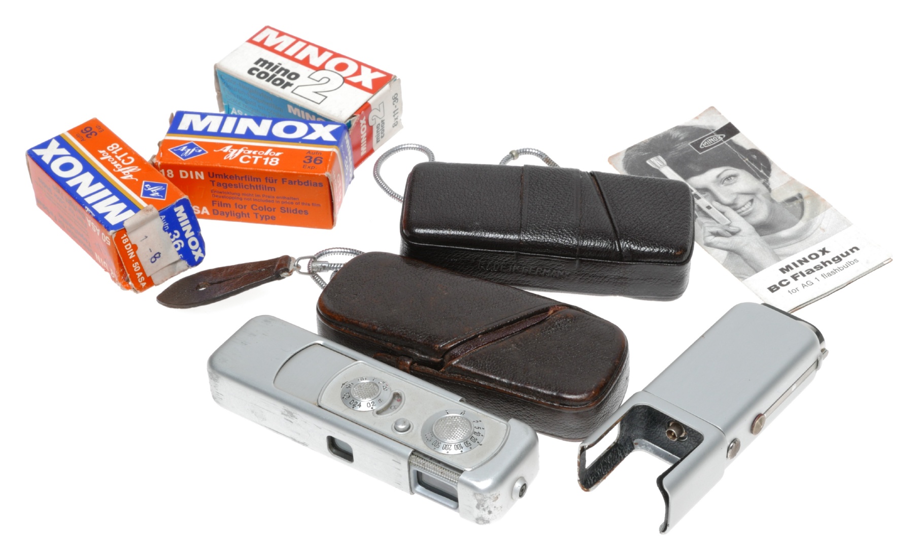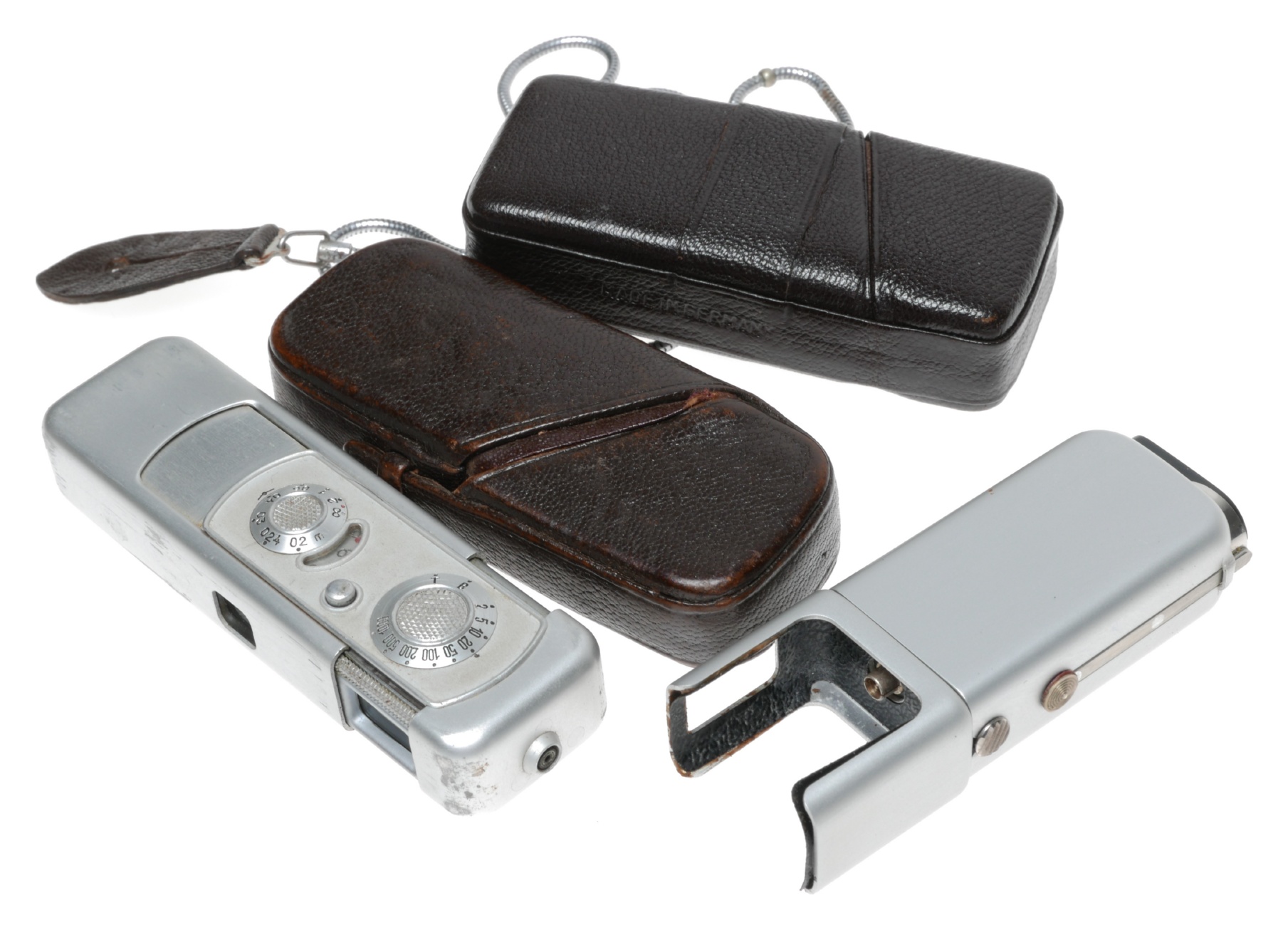 In well-used vintage condition, this makes for an interesting collector's camera and flash collection considering that these were often used as spy cameras, ca.1948. Supplied in original leather pouches.