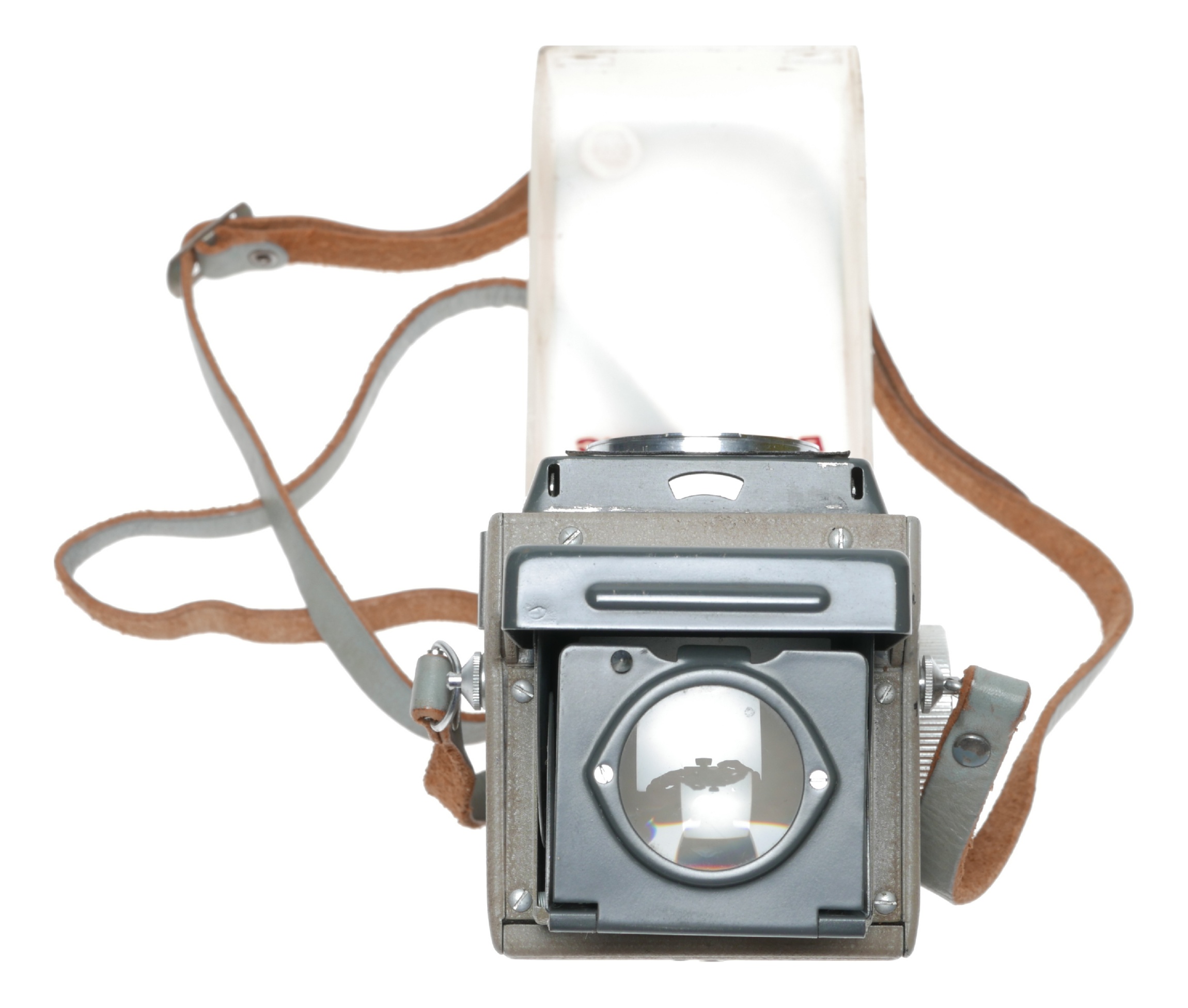 Ca.1959-1960, Smoke blue 4x4 format TLR film camera, in very good vintage condition and supplied with original removable front cover. The selenium meter is covered, as seen in my pictures, as it was stored this way for protection.