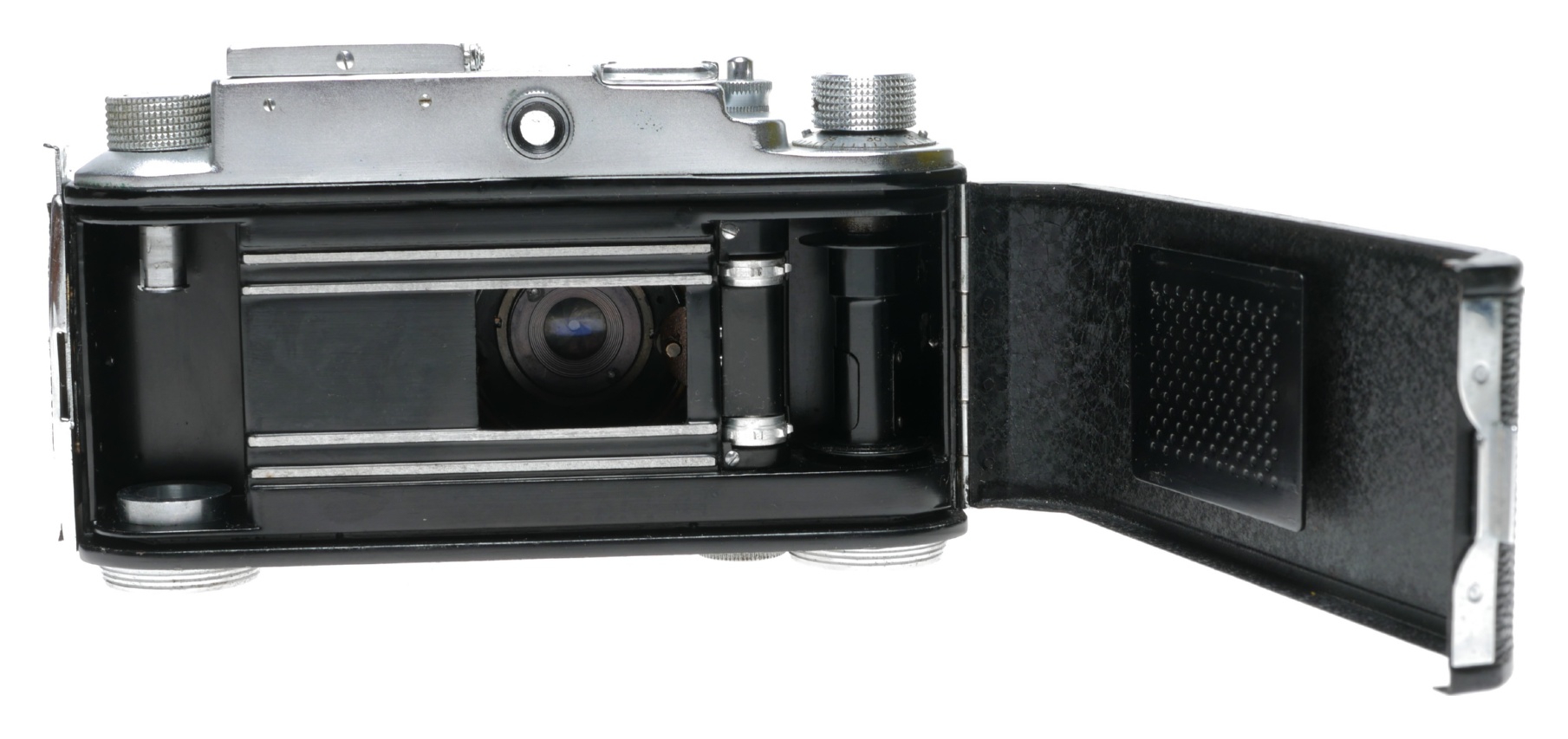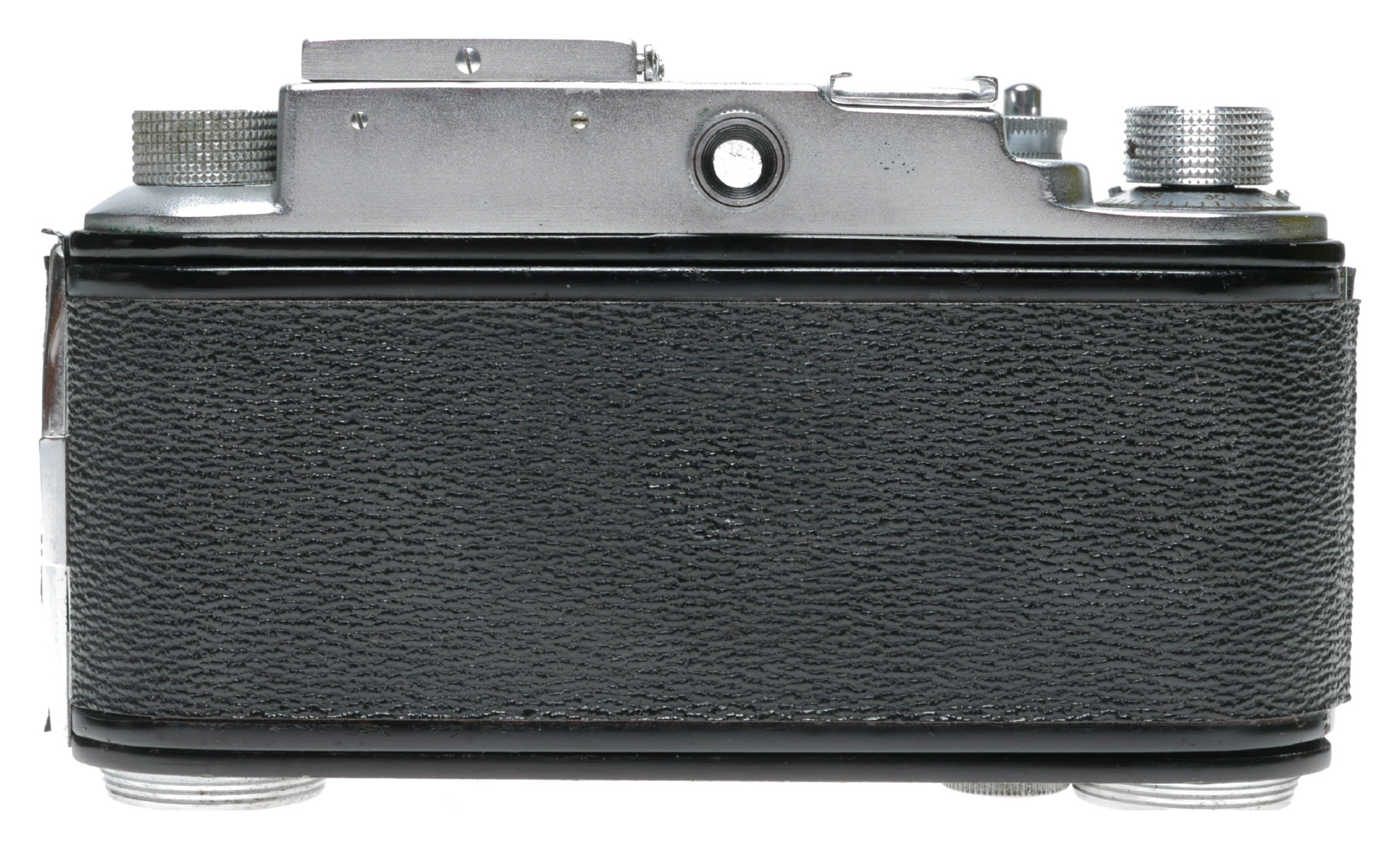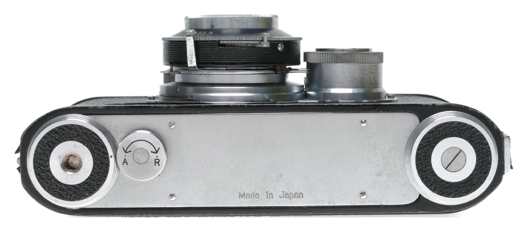 This model is the second version, fitted with no-name shutter (B, 1�300), possibly made by Tougodo. No.57504, made in Japan, ca.1957. Supplied in original leather keeper.