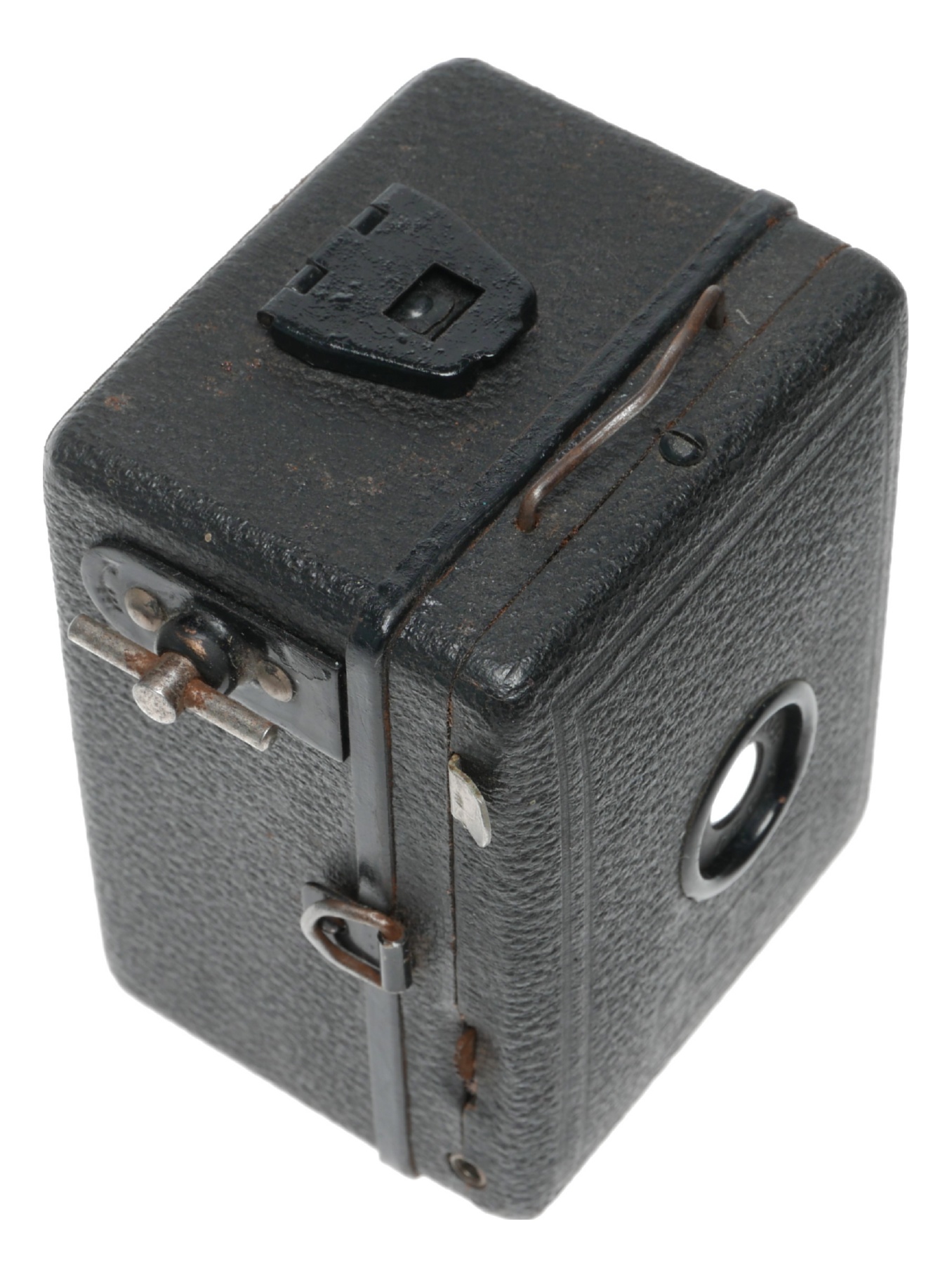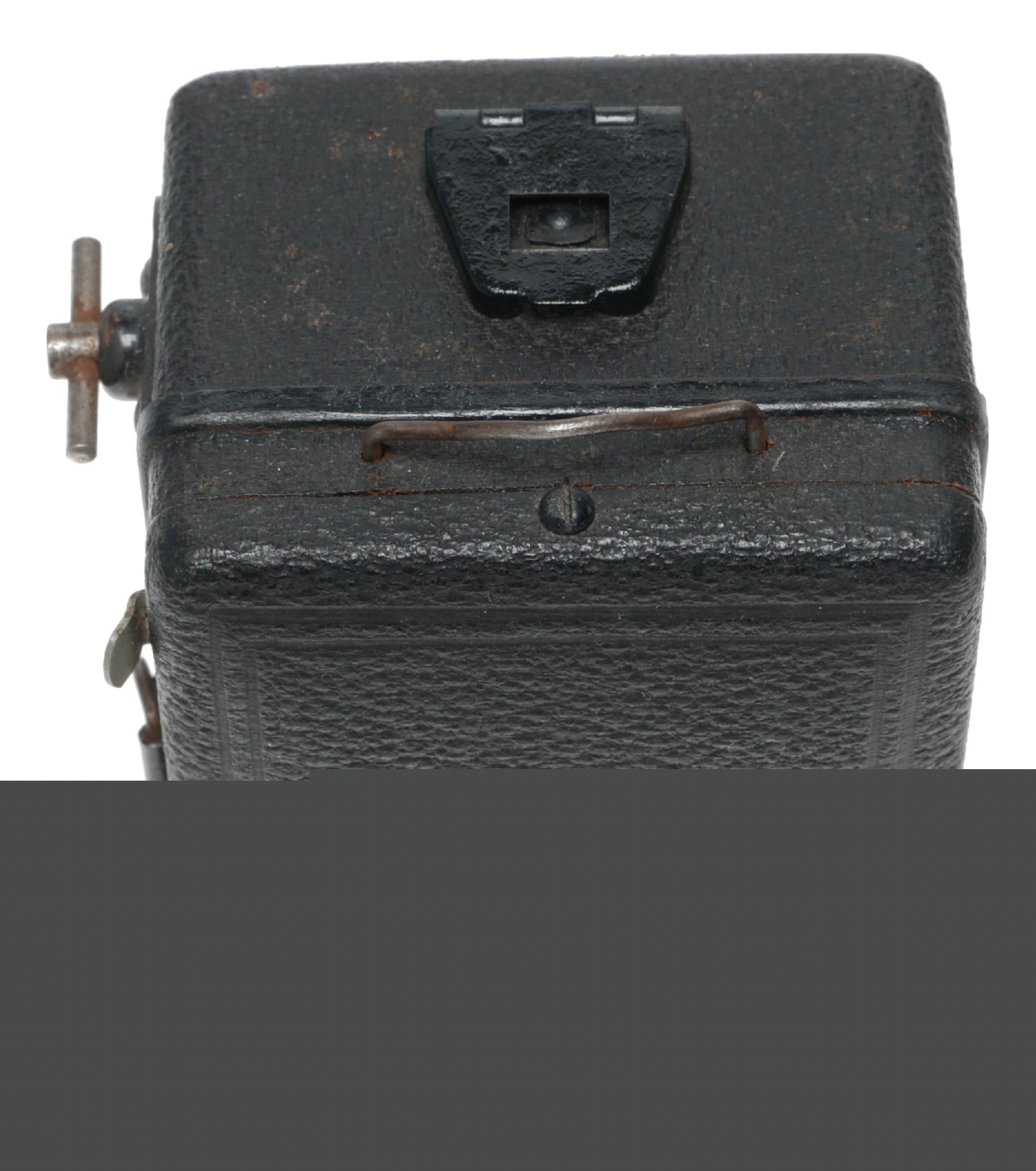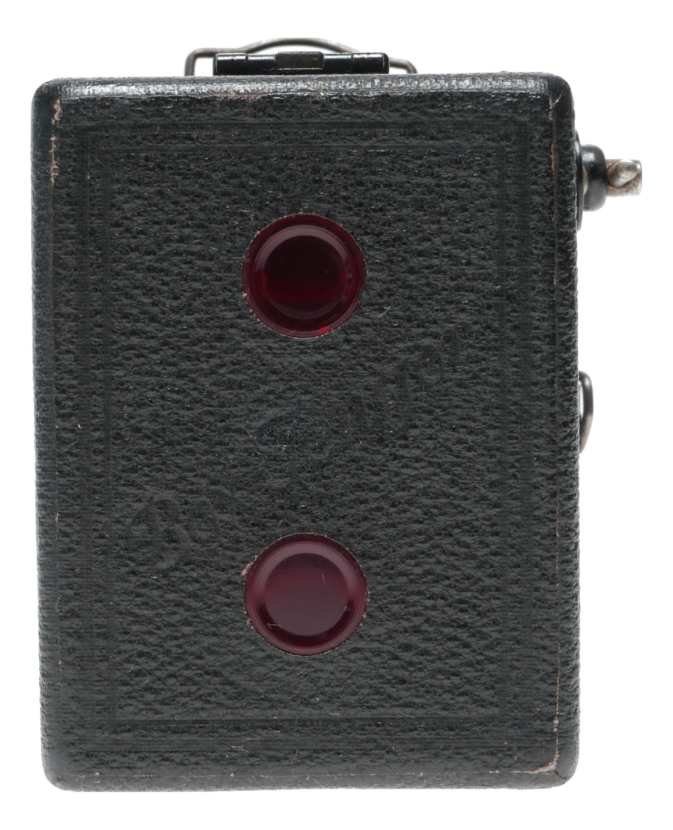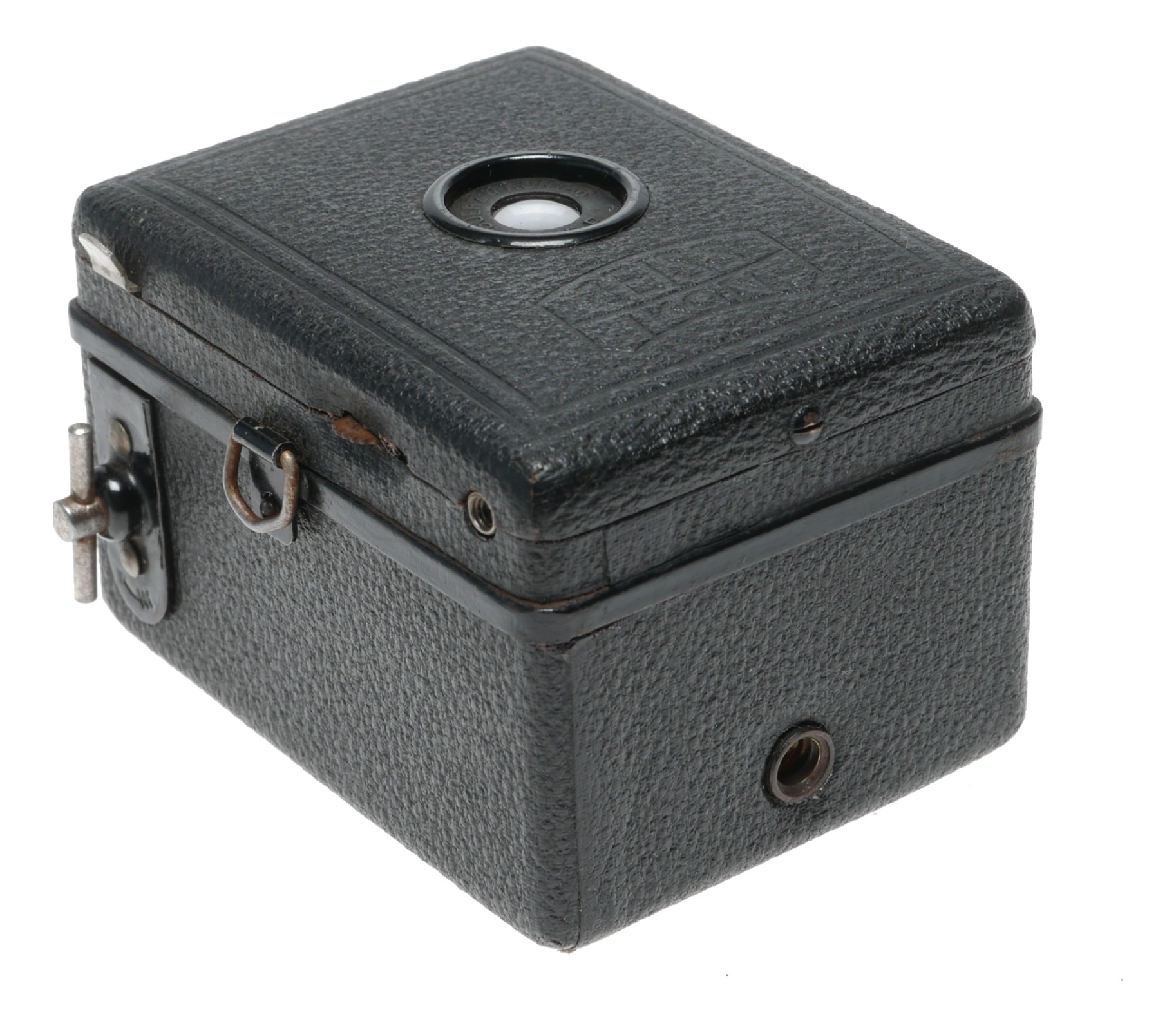 Ca.1930, vintage metal box miniature camera, for type No. 127 film rolls with small sports finder and single-speed shutter. It had a Frontar f/11 lens and a single speed shutter. This is the earlier model. In good and well-aged condition.