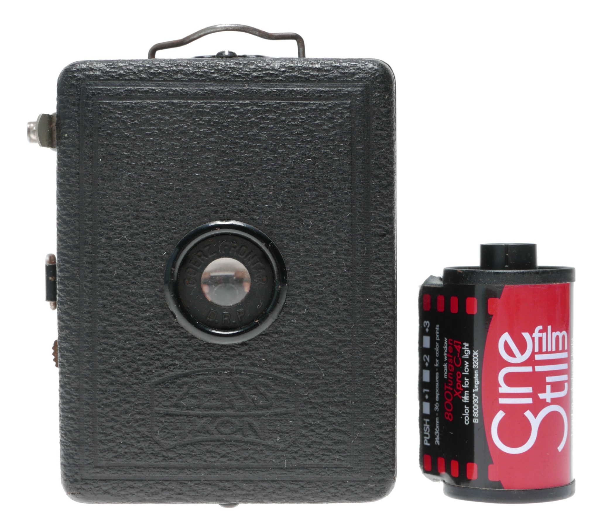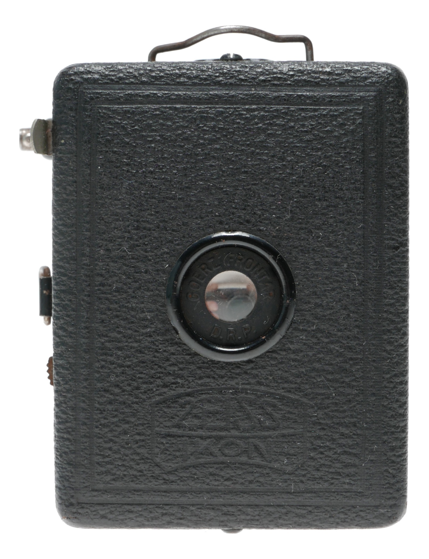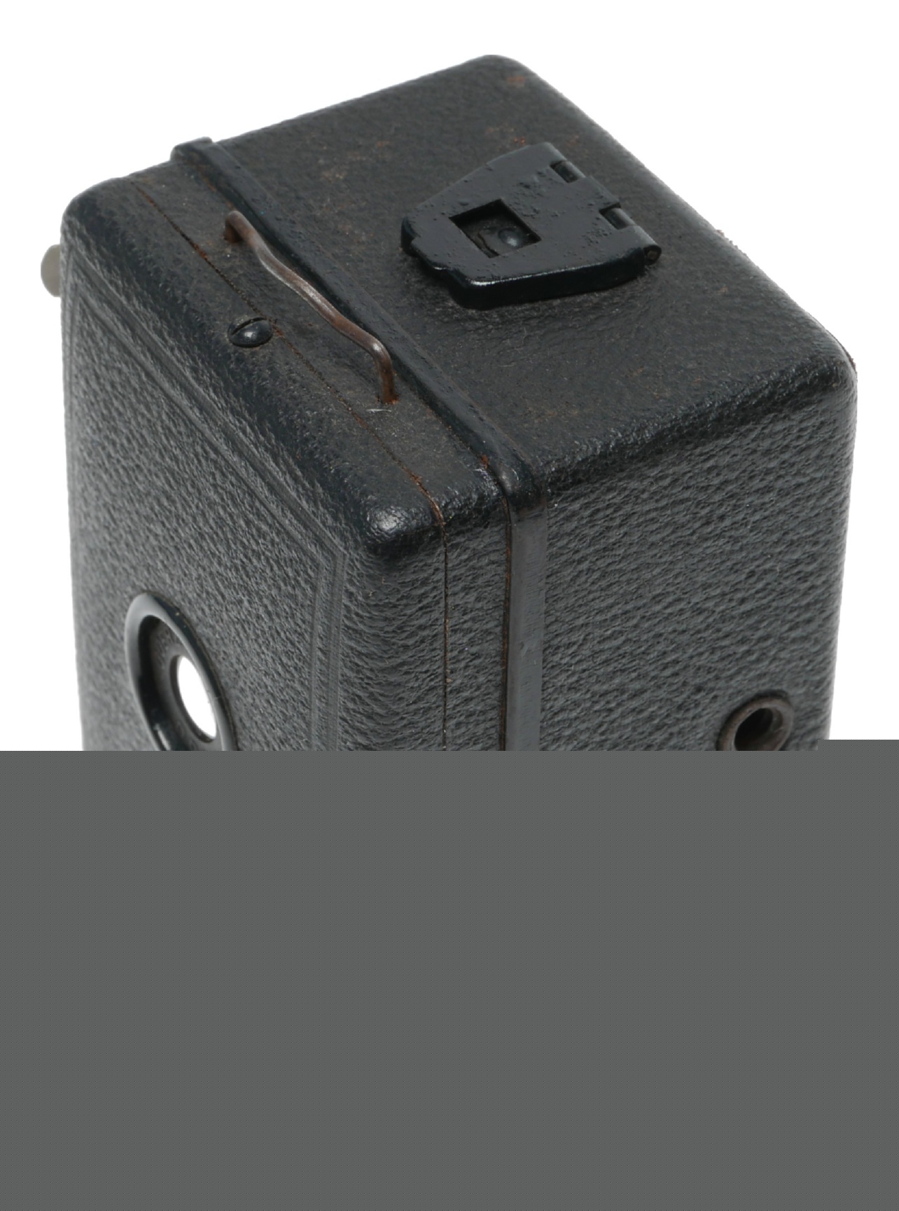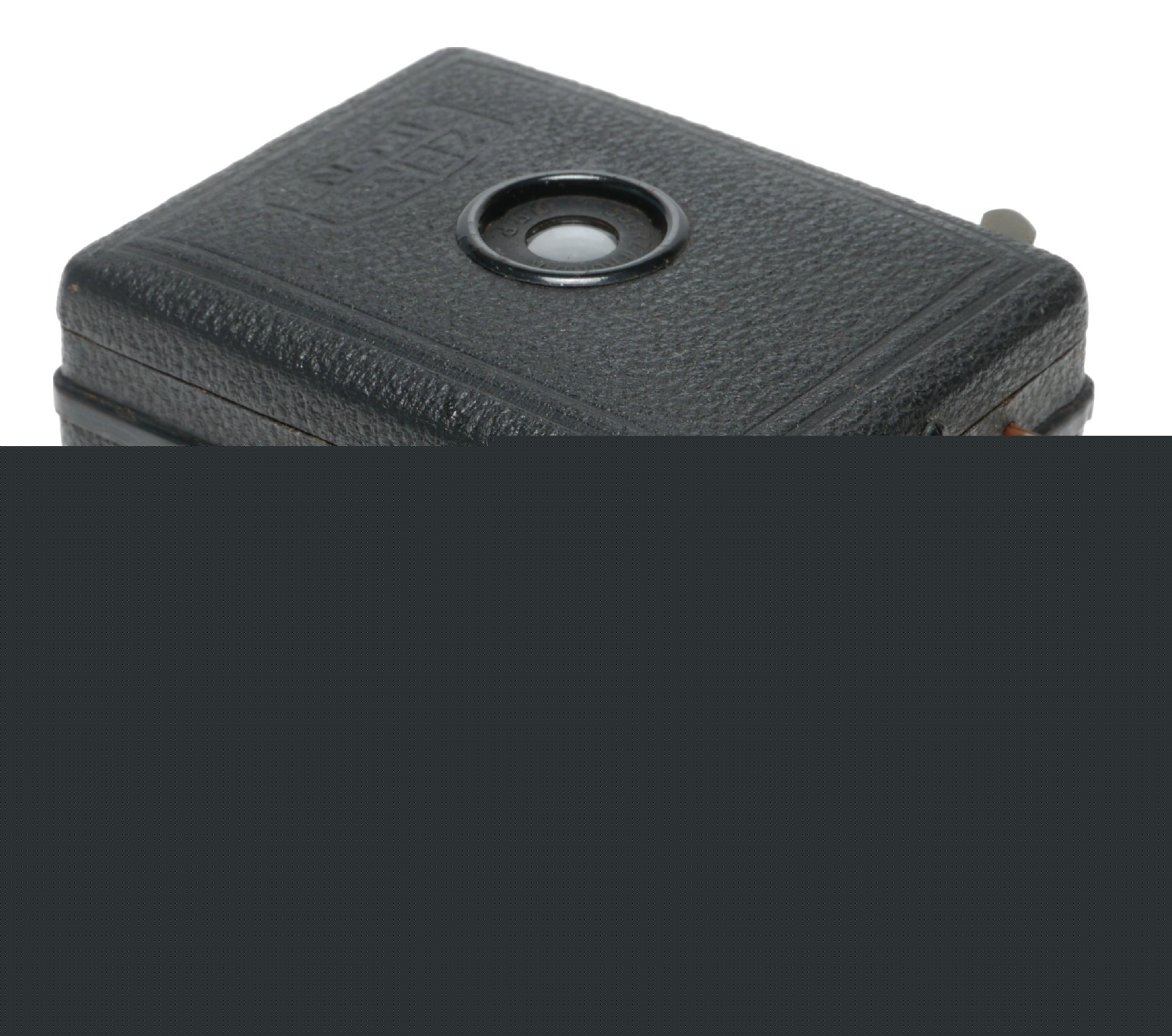 Ca.1930, vintage metal box miniature camera, for type No. 127 film rolls with small sports finder and single-speed shutter. It had a Frontar f/11 lens and a single speed shutter. This is the earlier model. In good and well-aged condition.