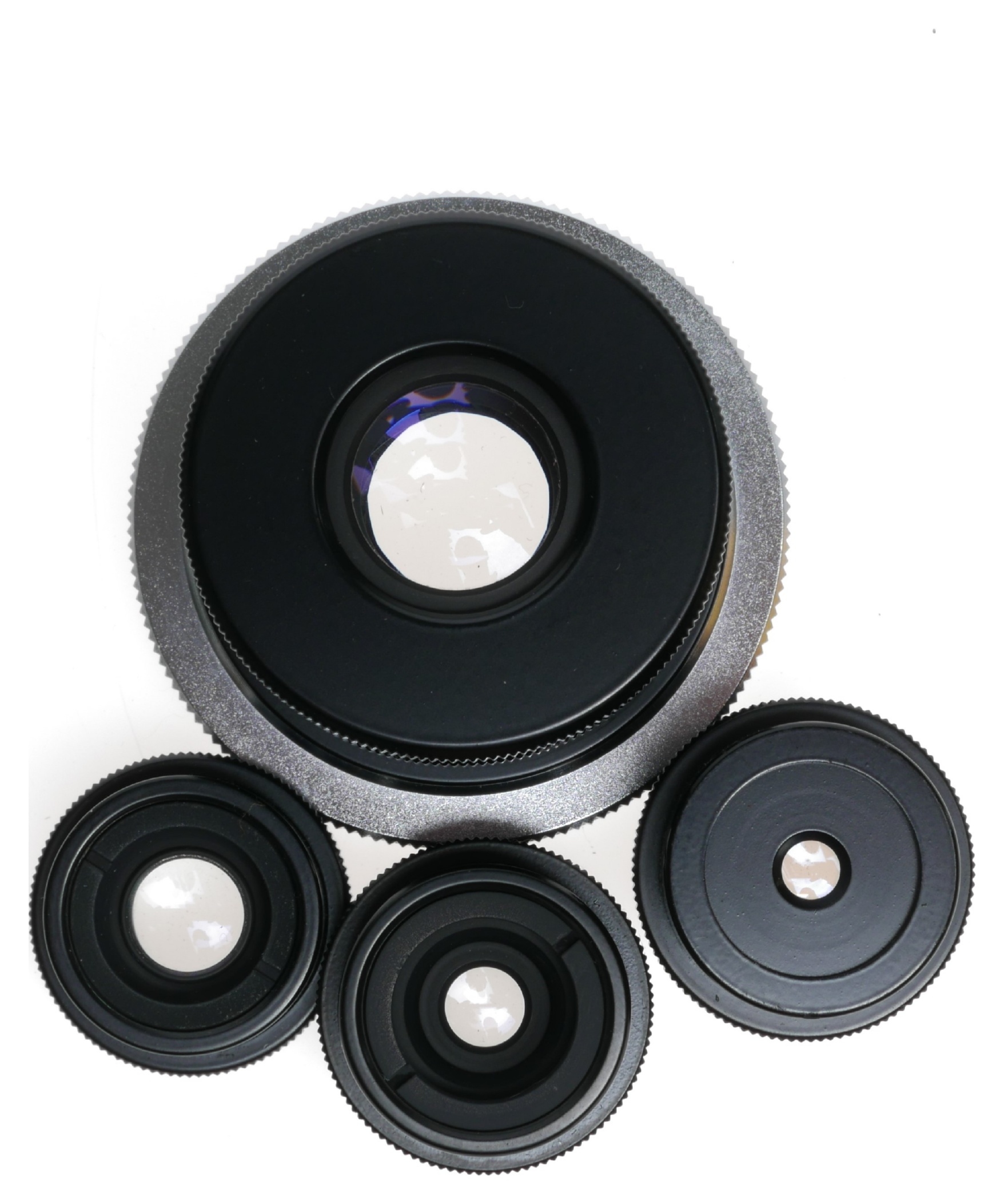 This exquisite set of c-mount macro close-up lenses is supplied with the Contarex adapter. Lenses include the very special Carl Zeiss 100mm 1:6.3, 40mm 1:4.5, Luminar 25mm 1:3.5 and 16mm 1:2.5.
