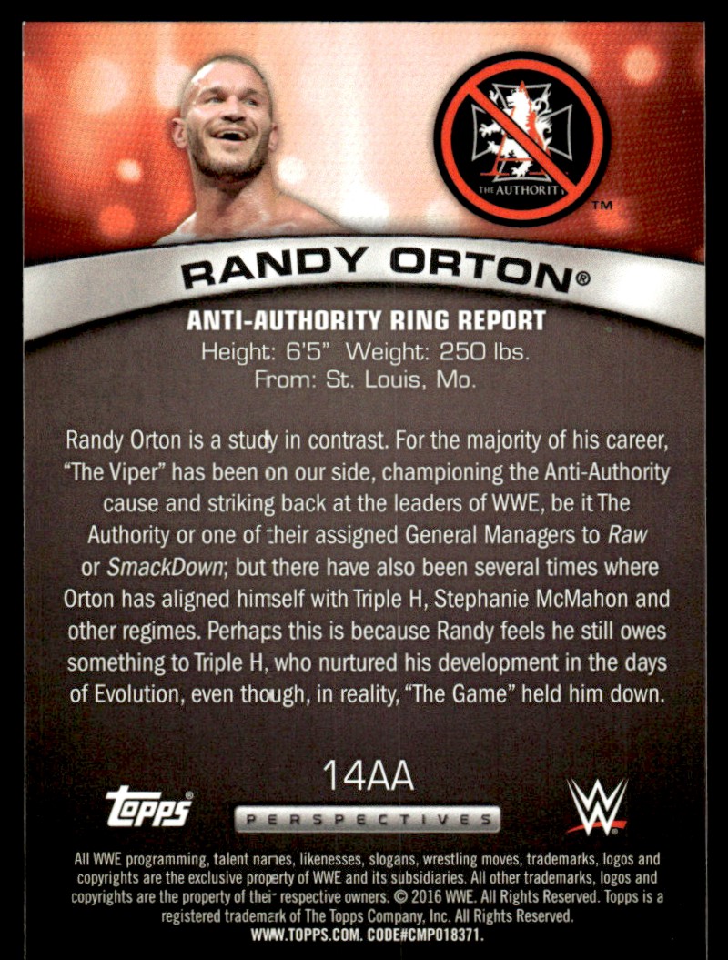 | 2016 Topps WWE Anti-Authority Ring Report Perspectives Randy Orton #14AA |