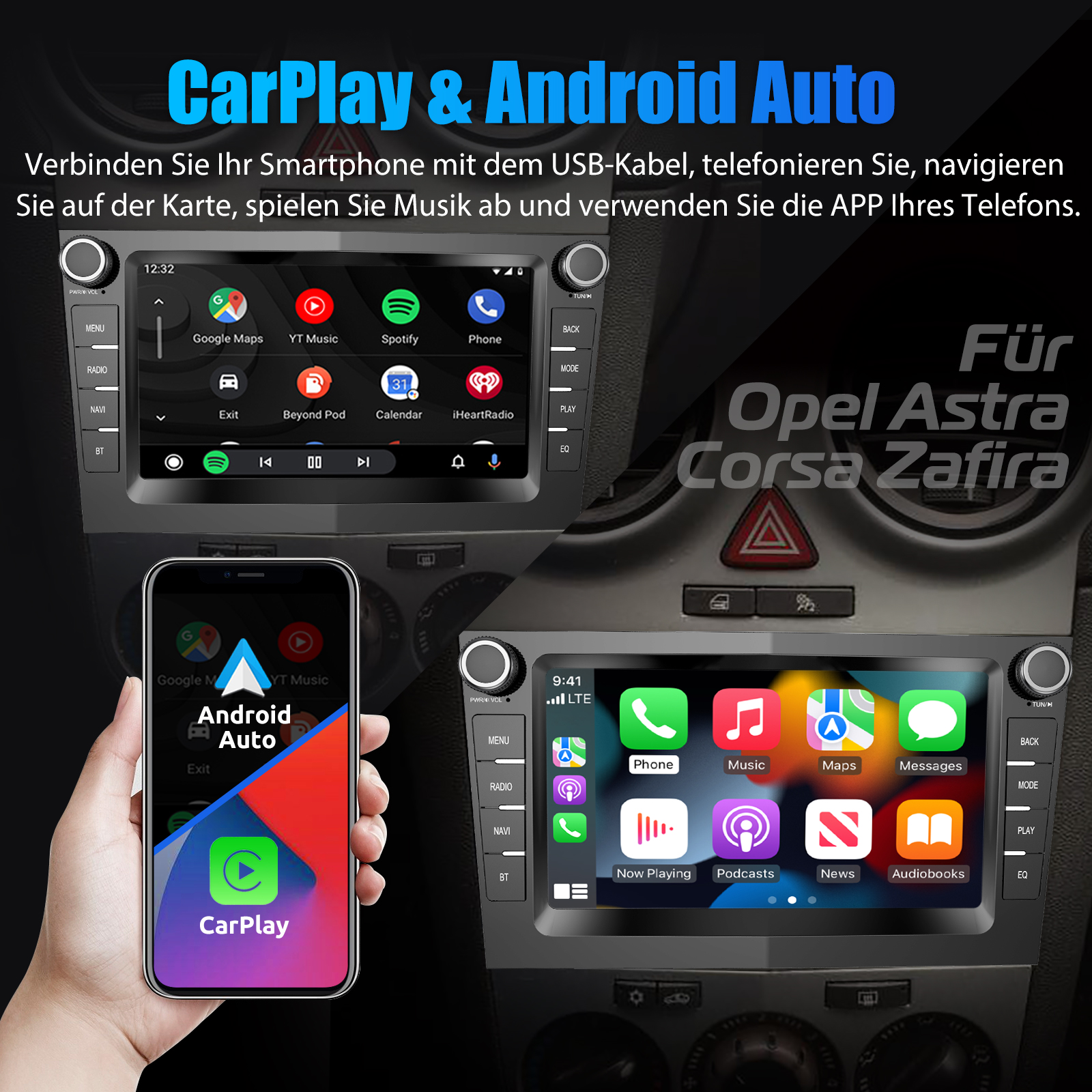 Drahtloses Carplay und Android Auto: Tauchen Sie ein in ein nahtloses und benutzerfreundliches Infotainment-Erlebnis mit Apple CarPlay & Android Auto. Verbinden Sie Ihr iPhone mit Apple CarPlay oder Ihr Android-Smartphone mit Android Auto und greifen Sie sicher auf Anrufe, Textnachrichten, Navigation, Musik und vieles mehr zu. Mit intuitiver Bedienung über den Touchscreen oder Sprachsteuerung haben Sie alle Funktionen bequem zur Hand, während Sie sicher am Steuer bleiben. Nutzen Sie Ihre bevorzugten Apps und bleiben Sie jederzeit verbunden, während Sie den Blick auf die Straße gerichtet haben. Machen Sie Ihr Fahrzeug zu einem erweiterten Hub für Ihre mobilen Geräte und erleben Sie eine neue Dimension des Infotainments.