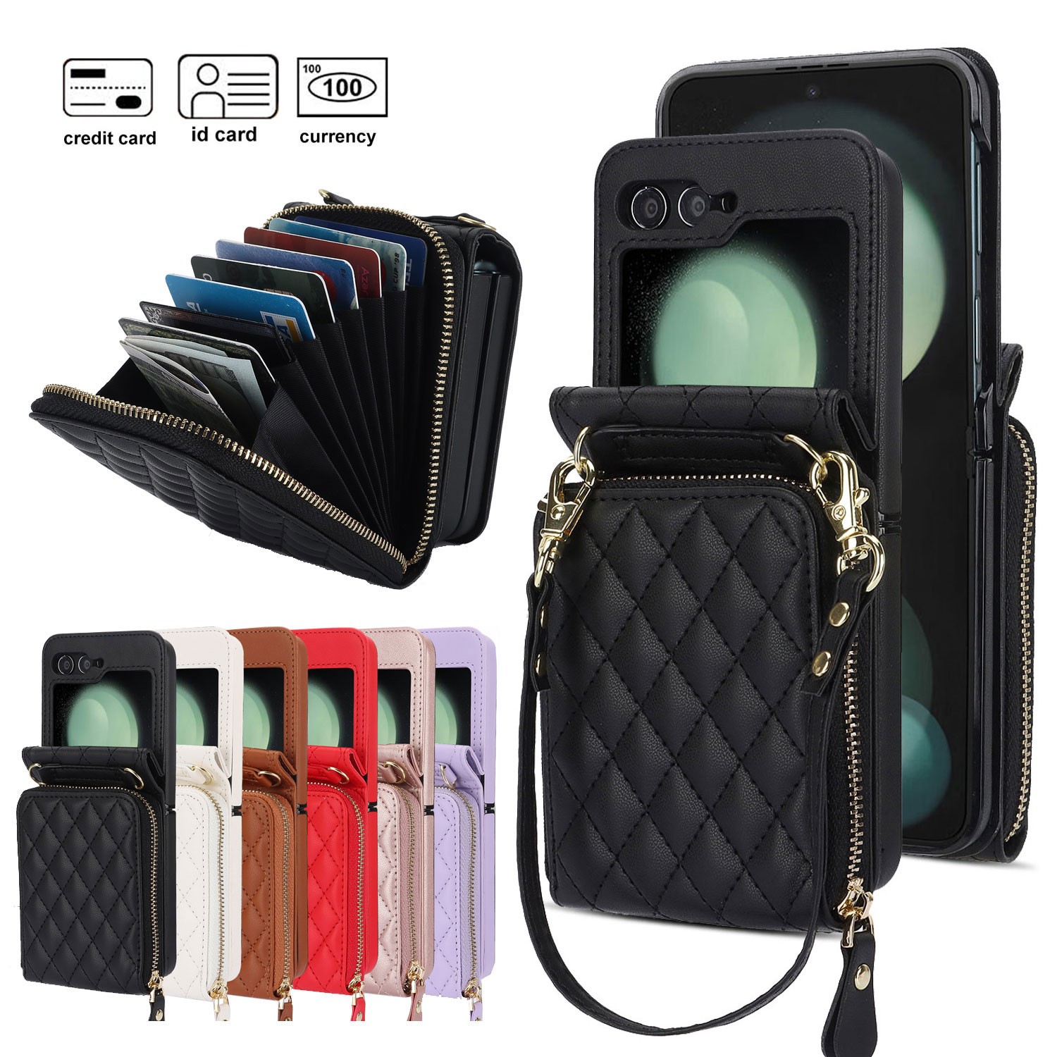 | New Luxury Grid Leather Handy Flip Credit card Slots Wallet Two Lanyards Case Cover For Samsung Galaxy Z Flip 3 4 5 6 7 |
