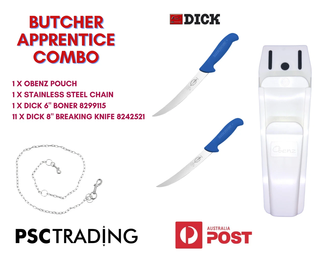 F DICK 2 Piece Butcher Stainless Steel Knife Combo Kit with pouch and stainless steel chain.