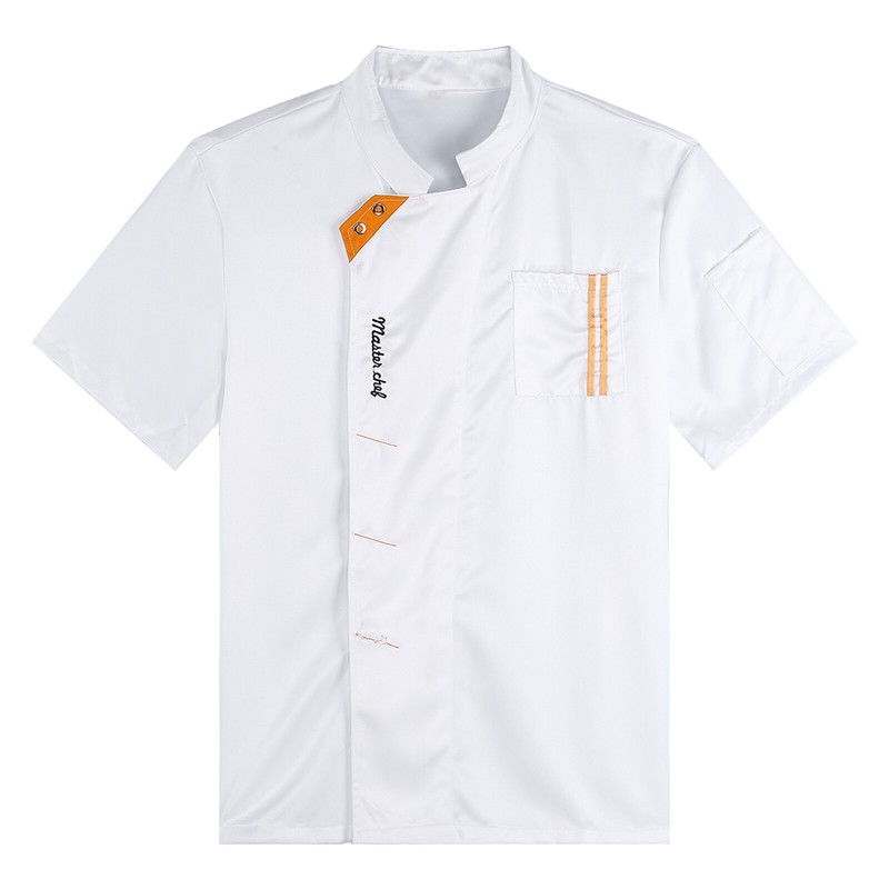 Unisex chef jacket with letter embroidery and stylish details, stand collar looks professional, buttons closure for easy wearing.