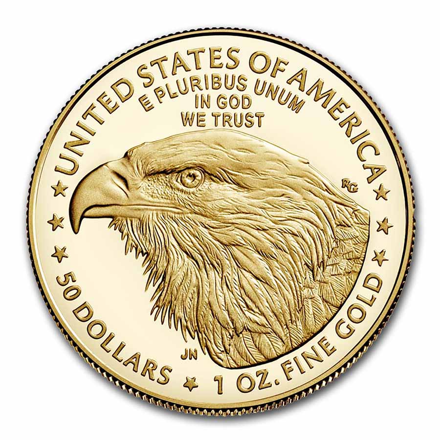 The United States Mint unveiled updated Type 2 reverse designs for the 2021 American Eagle Gold coins. 2021 marked the 35th anniversary of the American Eagle coin program, and the designs began appearing on these coins in mid-year 2021. Mint Artistic Infusion Program (AIP) designer Jennie Norris created the Gold coin design that was sculpted by Mint Medallic Artist Renata Gordon. The reverse design depicts a bold, up-close portrait of an eagle. The obverse has been revised with additional detail from the original design by Augustus Saint-Gaudens to enhance this classic image.
